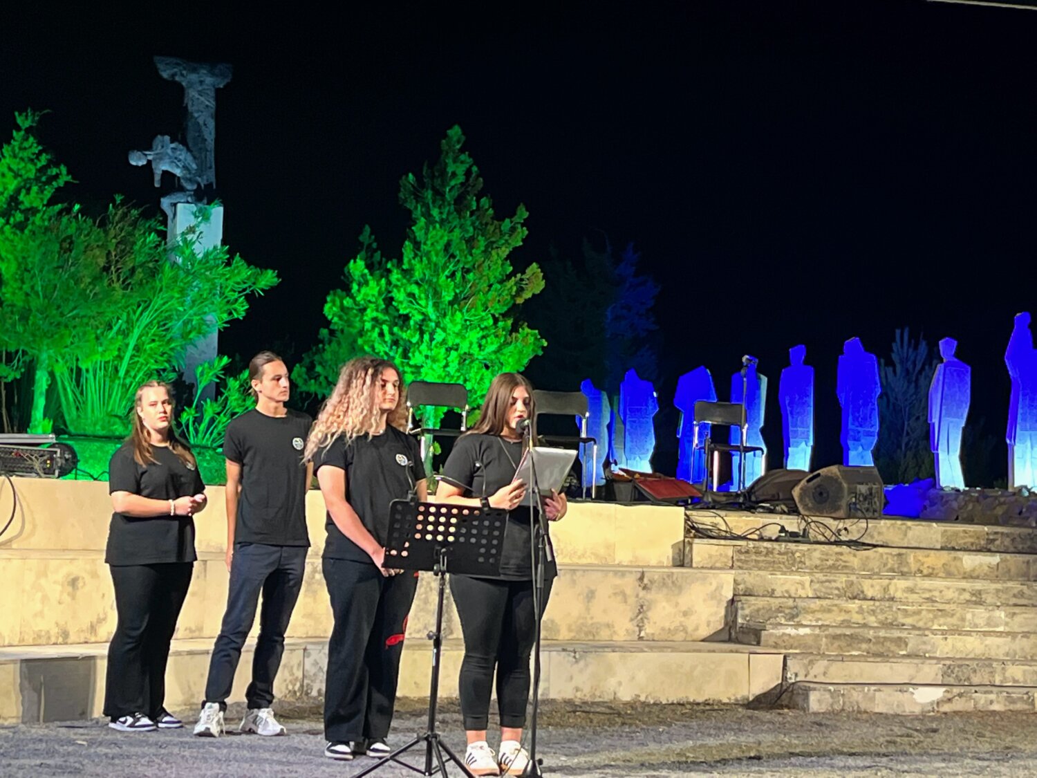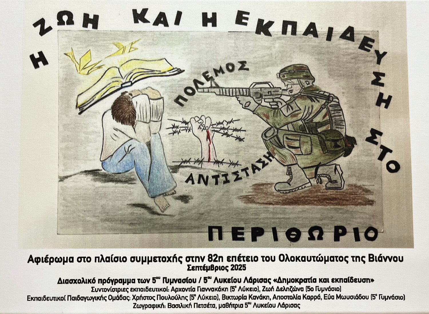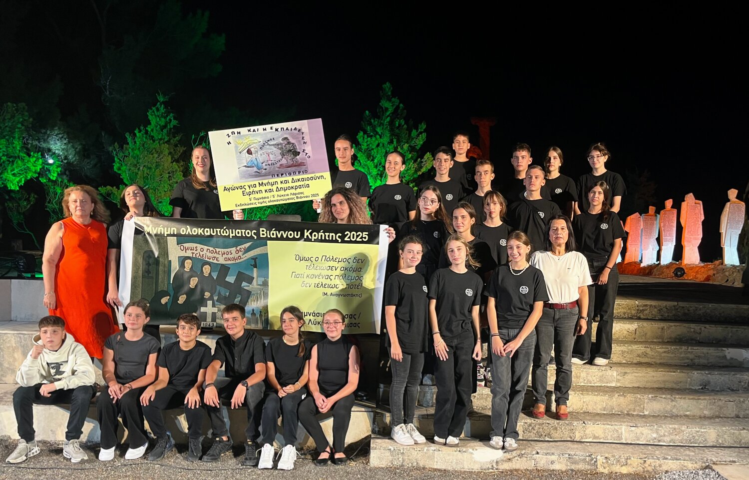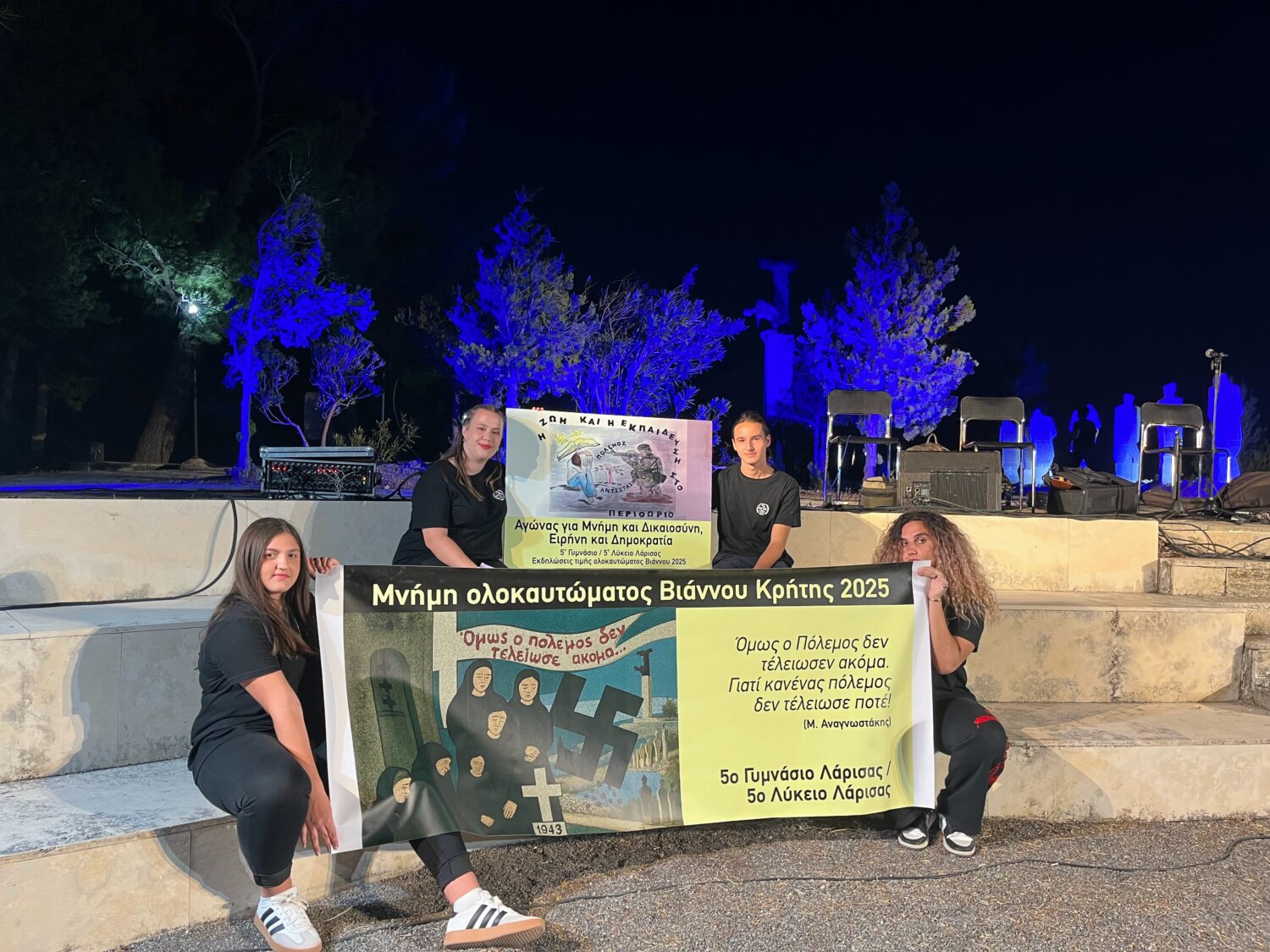 «Βλέπε, Άκου, Μίλα για τις βαρβαρότητες του Β’ παγκοσμίου πολέμου, για τους Μαρτυρικούς τόπους, για την Αντίσταση, για τους Αλύγιστους»: Ήταν το μήνυμα που μεταδόθηκε μέσω του θεατρικού, το οποίο παρουσίασαν μαθητές και μαθήτριες του 5ου Γυμνασίου και του 5ου Λυκείου Λάρισας, σε συνεργασία με το Γυμνάσιο Βιάννου Κρήτης, σε εκδήλωση στο Πανδημοτικό Ηρώο Αμιρά, το Σάββατο 13 Σεπτεμβρίου 2025, τιμώντας τα 82 χρόνια από το Ολοκαύτωμα των χωριών της Βιάννου και της Δυτικής Ιεράπετρας.