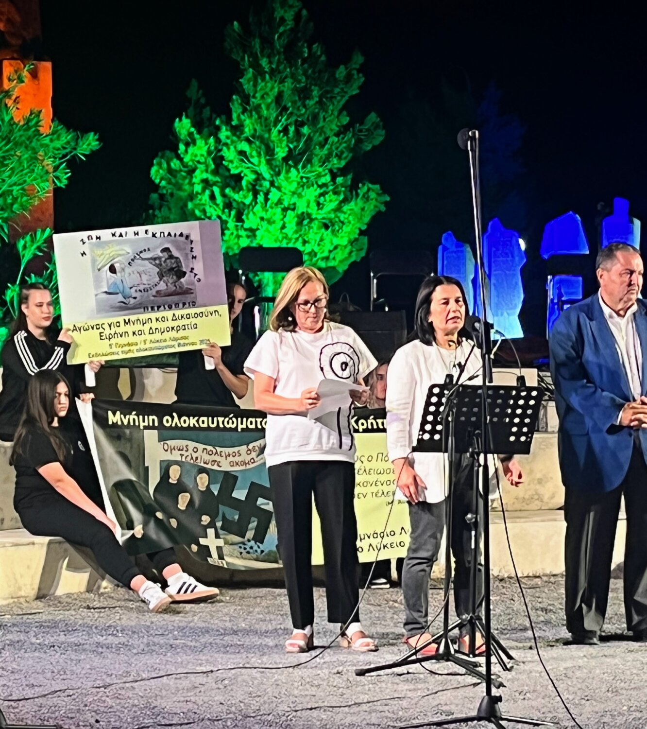 «Ως σχολεία που μετέχουμε στη σημερινή εκδήλωση, αφιερώνουμε το θεατρικό μας στα «Καημένα χωριά» της Βιάννου, φωνάζοντας για τις ωμότητες των εκτελέσεων αθώων αμάχων ανδρών, γυναικών, παιδιών, γερόντων και αναπήρων», επισήμανε η εκπαιδευτικός Αρχοντία Γιαννακάκη συντονίστρια του διασχολικού προγράμματος από την πλευρά του 5ου Λυκείου. Η εκπαίδευση τόνισε μπορεί να καλλιεργήσει μνήμη, ευαισθησία και αγωνιστική διάθεση, καθώς οι εισβολές, οι εκτοπισμοί, οι γενοκτονίες δεν ανήκουν μόνον στο παρελθόν.