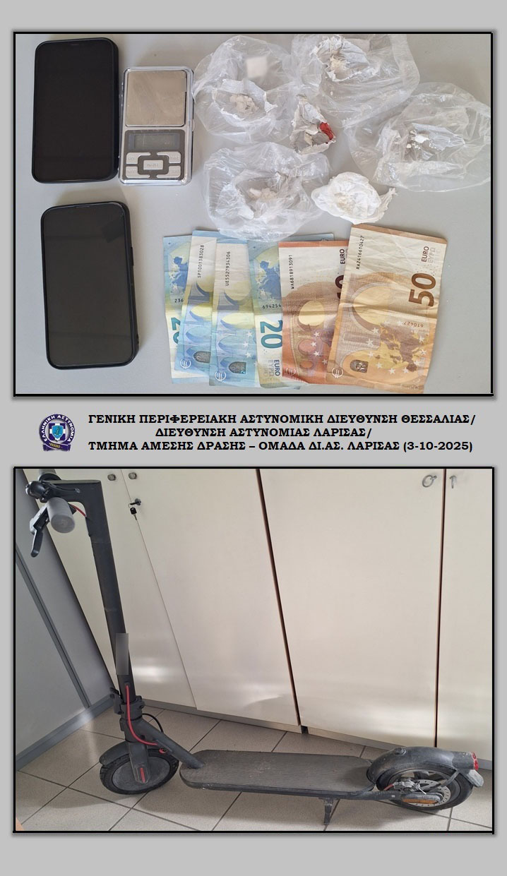 Συνελήφθησαν, χθες (2-10-2025) το βράδυ στη Λάρισα, από αστυνομικούς της Ομάδας Δίκυκλης Αστυνόμευσης (ΔΙ.ΑΣ.) Λάρισας, -2- ημεδαποί, εκ των οποίων ο ένας ανήλικος, για παράβαση της νομοθεσίας περί ναρκωτικών.