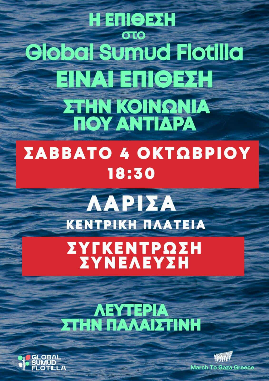 Η Κομμουνιστική Απελευθέρωση «συμμετέχει και στηρίζει την αυριανή συγκέντρωση -συνέλευση στην Κεντρική Πλατεία ( δικαστικό) που διοργανώνουν συλλογικότητες, οργανώσεις, αγωνίστριες, αγωνιστές για την δολοφονική επίθεση του σιωνιστικού κράτους στον στόλο της ελευθερίας global sumud flotilla που πήγαινε ανθρωπιστική βοήθεια στην Γάζα και το κράτος τρομοκράτης του Ισραήλ τους συνέλαβε σε διεθνή ύδατα και τους κρατάει φυλακισμένους στο Ισραήλ.