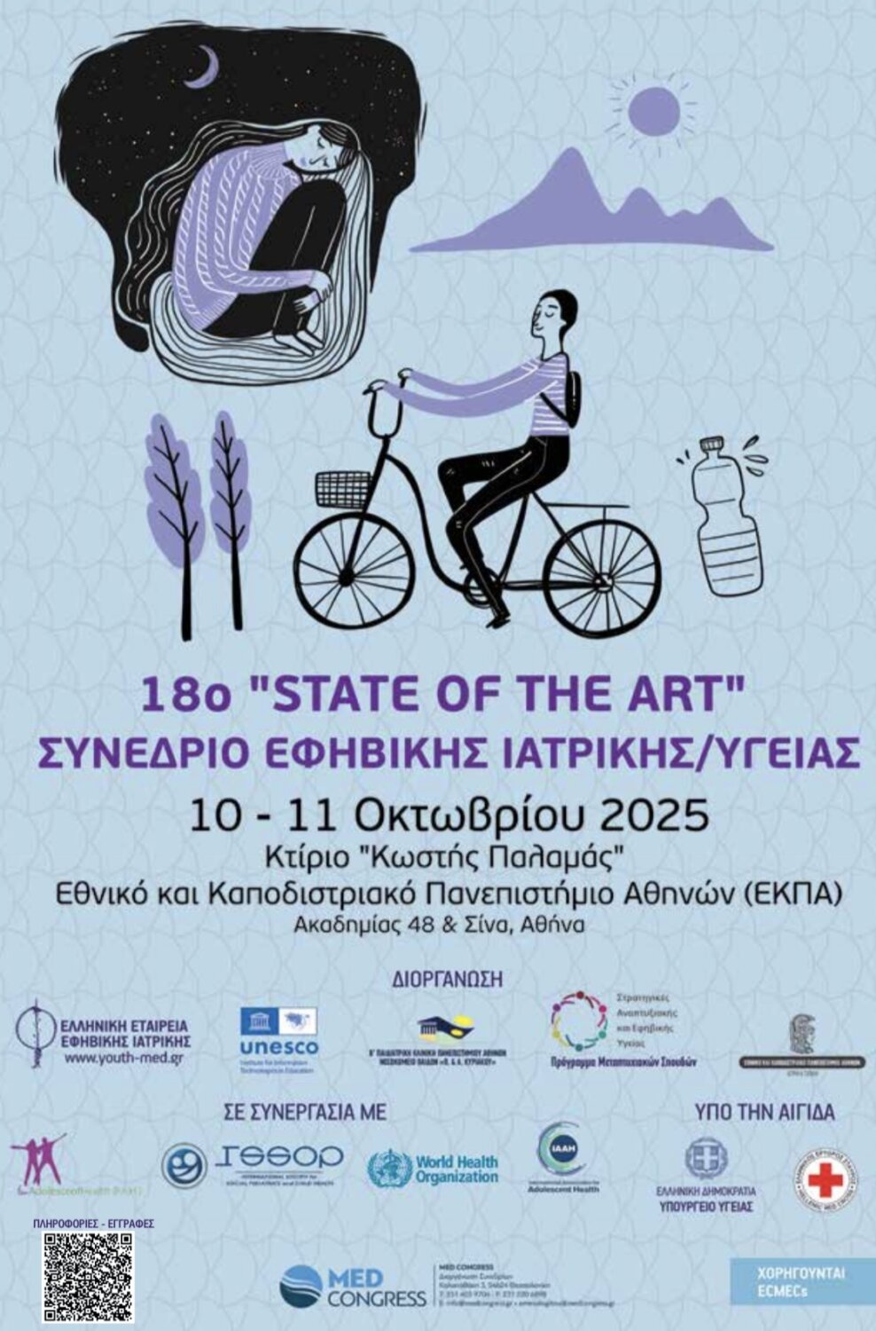 Η Ελληνική Εταιρεία Εφηβικής Ιατρικής, το Εθνικό και Καποδιστριακό Πανεπιστήμιο Αθηνών (ΕΚΠΑ), η Β’ Παιδιατρική Κλινική Πανεπιστημίου Αθηνών – Νοσοκομείο Παίδων «Π. & Α. Κυριακού» και η UNESCO GHE (Global Health Education) συνδιοργανώνουν το 18ο “State of the Art” Συνέδριο Εφηβικής Ιατρικής/Υγείας στις 10 και 11 Οκτωβρίου 2025, στην Αθήνα.
