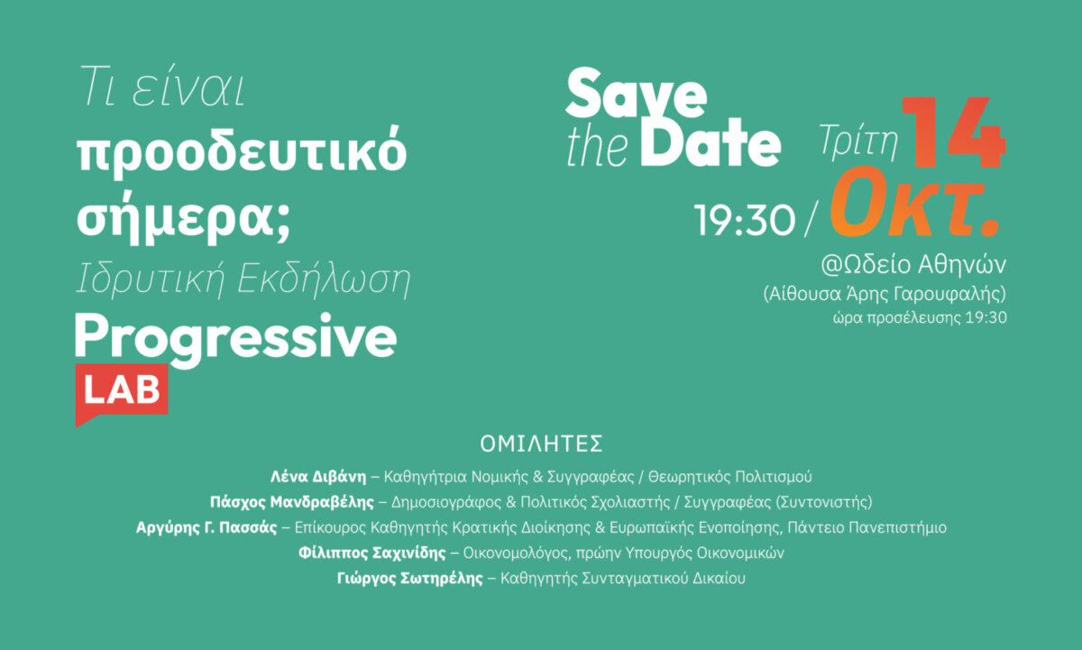 Το Progressive Lab «σας προσκαλεί στην Ιδρυτική Εκδήλωση του με θέμα: «Τι είναι προοδευτικό σήμερα;», την Τρίτη 14 Οκτωβρίου 2025 στις 19:30 (ώρα προσέλευσης) στο Ωδείο Αθηνών – Αίθουσα Άρης Γαρουφαλής.