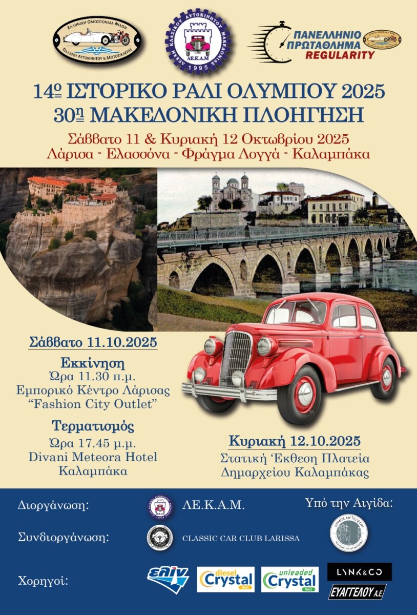 Το Σάββατο 11 και την Κυριακή 12 Οκτωβρίου θα πραγματοποιηθεί το «14ο Ιστορικό Ράλι Ολύμπου 2025–30ή Μακεδονική Πλοήγηση ΛΕΚΑΜ» που θα ξεκινήσει από τη Λάρισα προς Ελασσόνα, Φράγμα Λογγά και Καλαμπάκα.
