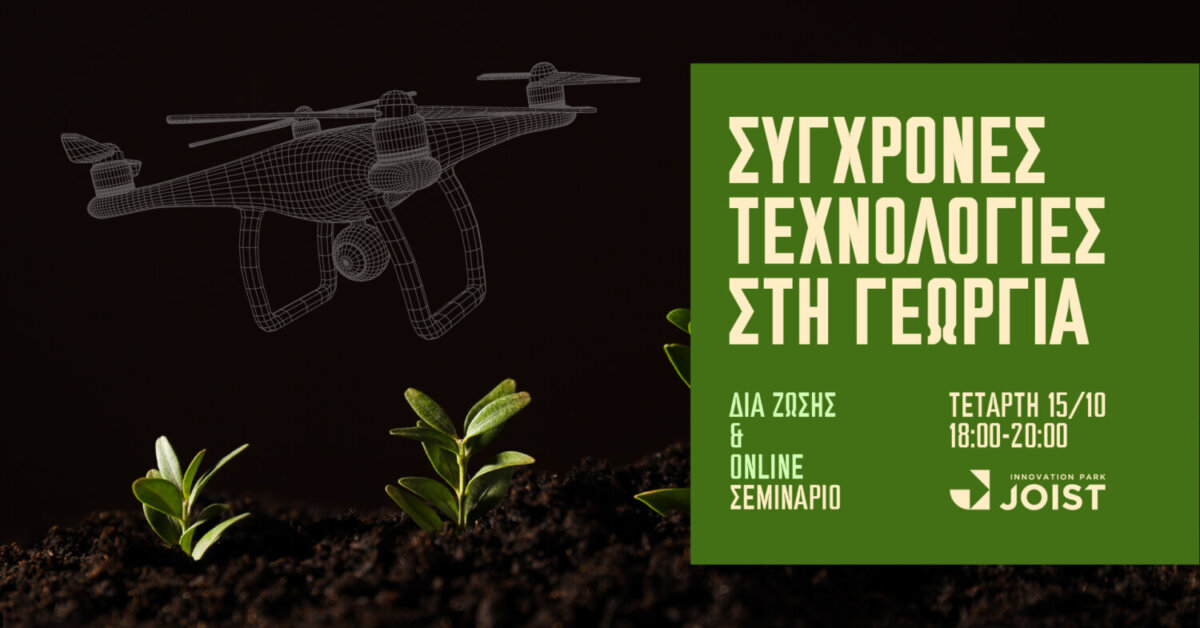 Η τεχνολογία αλλάζει ριζικά τον τρόπο που καλλιεργούμε και διαχειριζόμαστε τις γεωργικές μας εκτάσεις. Στο πλαίσιο αυτής της νέας εποχής, διοργανώνεται ένα πρακτικό σεμινάριο την Τετάρτη 15 Οκτωβρίου 2025 | 18:00 – 20:00 στο Πάρκο Καινοτομίας JOIST για τη χρήση σύγχρονων τεχνολογιών στη γεωργία, με στόχο να προσφέρει στους συμμετέχοντες τη γνώση και τα εργαλεία για πιο αποδοτική, βιώσιμη και ποιοτική παραγωγή.