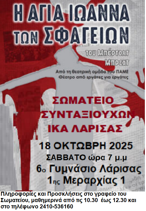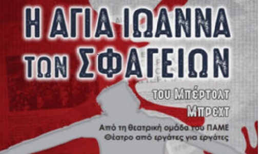 Η θεατρική ομάδα του ΠΑΜΕ παρουσιάζει το αριστούργημα του Μπέρτολτ Μπρεχτ, «Η Αγία Ιωάννα των Σφαγείων», το Σάββατο 18 Οκτώβρη και ώρα 7 μ.μ. στο αμφιθέατρο του 6ου Γυμνασίου Λάρισας, ένα έργο που παραμένει συγκλονιστικά επίκαιρο σχεδόν έναν αιώνα μετά τη συγγραφή του.