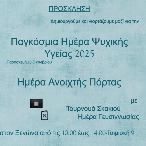 Με αφορμή την Παγκόσμια Ημέρα Ψυχικής Υγείας που γιορτάζεται κάθε χρόνο, την Παρασκευή 10 Οκτωβρίου 2025 διοργανώνουμε την Ημέρα Ανοιχτής Πόρτας (open day) από τις 10:00 έως τις 14:00.