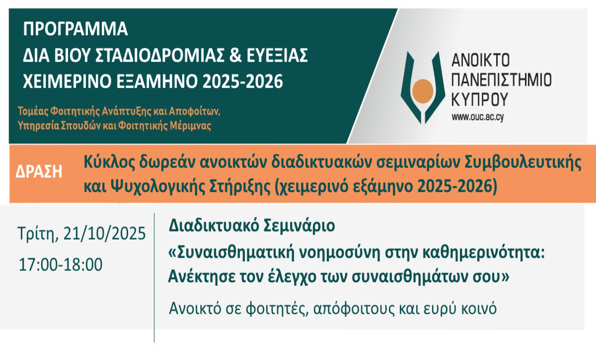 Το τηλεσεμινάριο «Συναισθηματική νοημοσύνη στην καθημερινότητα: Ανέκτησε τον έλεγχο των συναισθημάτων σου» με εισηγήτρια την Δρ. Νάταλυ Λούμπα Φιλαρέτου, Εγγεγραμμένη Συμβουλευτική Ψυχολόγο και συνεργάτιδα του Γραφείου Συμβουλευτικής και Ψυχολογικής Στήριξης της Υπηρεσίας Σπουδών και Φοιτητικής Μέριμνας του Ανοικτού Πανεπιστημίου Κύπρου, θα διεξαχθεί την Τρίτη, 21 Οκτωβρίου 2025, μεταξύ 17.00 – 18.00.