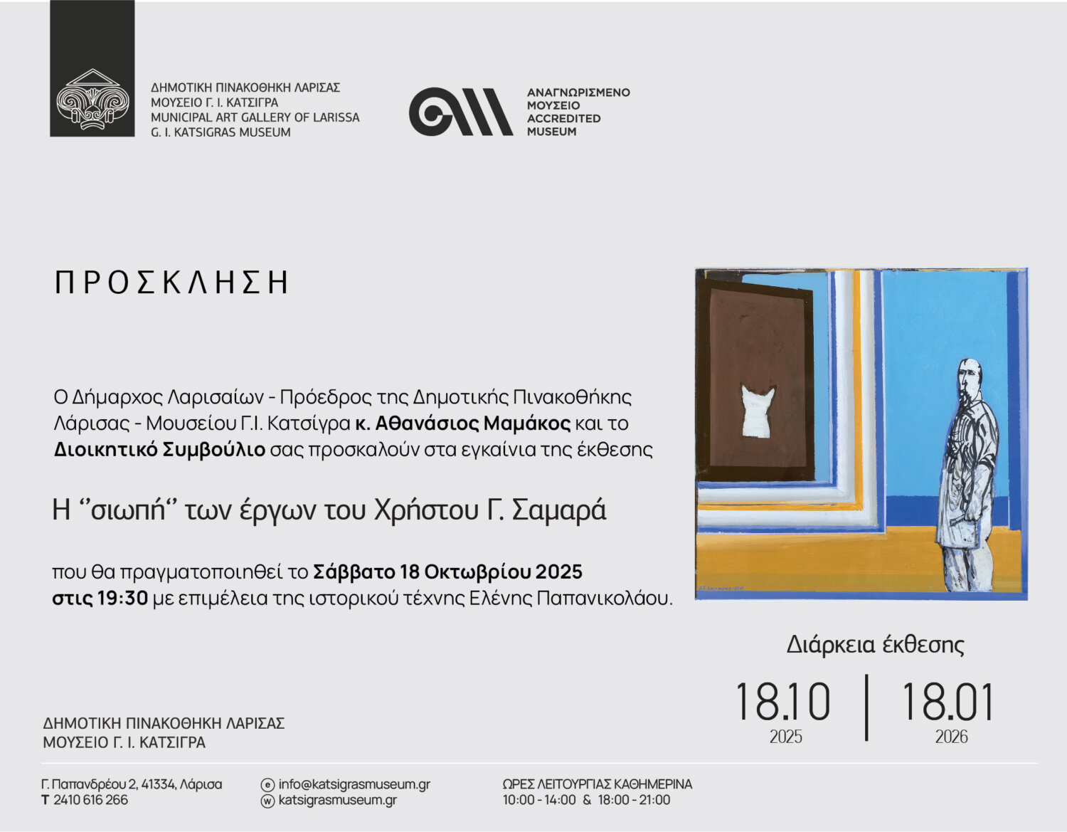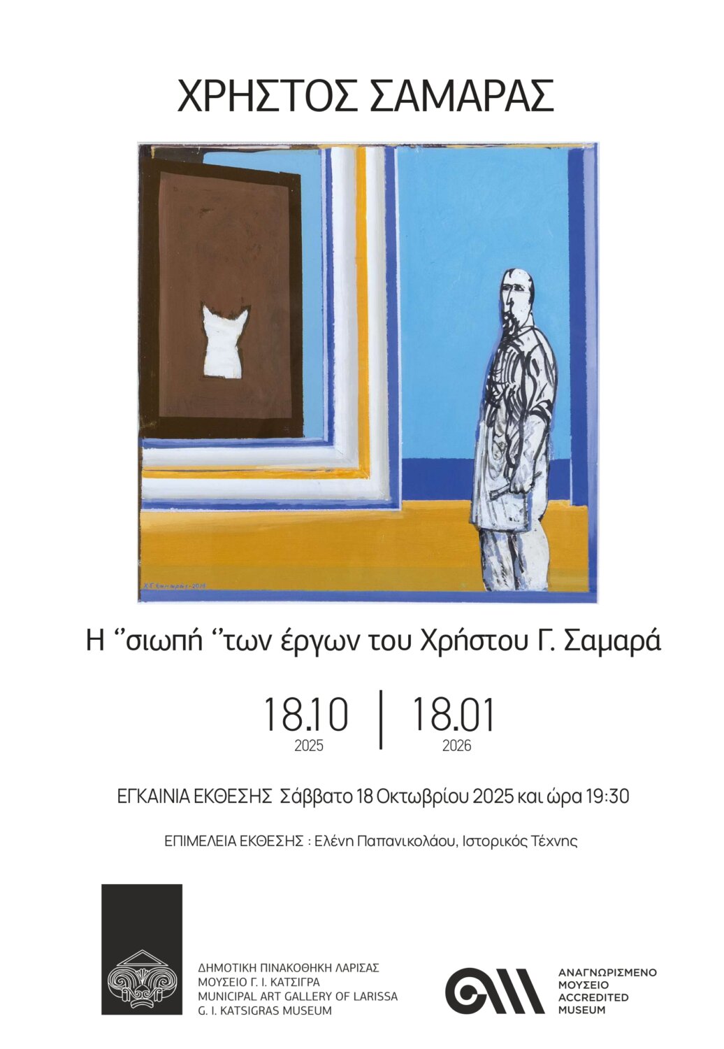 Το Σάββατο 18 Οκτωβρίου 2025 και ώρα 19:30 στην αίθουσα «Ειρήνης Κατσίγρα» θα εγκαινιαστεί από τον δήμαρχο Λαρισαίων και πρόεδρο του διοικητικού συμβουλίου, κ. Αθανάσιο Μαμάκο η έκθεση ‘‘Η «σιωπή» των έργων του Χρήστου Γ. Σαμαρά’’, σε επιμέλεια της ιστορικού τέχνης Ελένης Παπανικολάου.