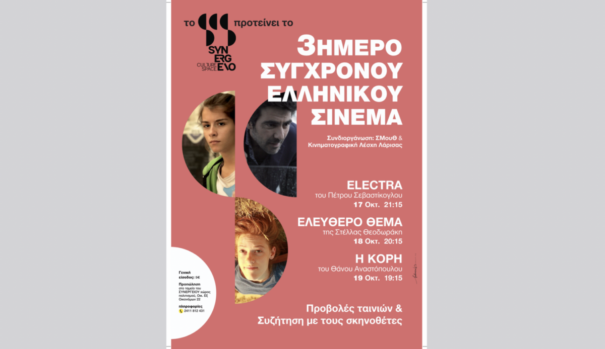 Το Συνεργείο Μουσικού Θεάτρου (ΣΜουΘ) και η Κινηματογραφική Λέσχη Λάρισας συνδιοργανώνουν τριήμερο αφιέρωμα στον σύγχρονο ελληνικό κινηματογράφο, παρουσιάζοντας το έργο τριών σημαντικών σκηνοθετών που χαράζουν διακριτές, προσωπικές πορείες στη νεότερη ελληνική φιλμογραφία. Συγκεκριμένα, το ΣΥΝΕΡΓΕΙΟ-χώρος πολιτισμού υποδέχεται τον Πέτρο Σεβαστίκογλου με την ταινία ELECTRA την Παρασκευή 17 Οκτωβρίου στις 9.15μμ, τη Στέλλα Θεοδωράκη με την ταινία ΕΛΕΥΘΕΡΟ ΘΕΜΑ το Σάββατο 18 Οκτωβρίου στις 8.15μμ και τον Θάνο Αναστόπουλο με την ταινία Η ΚΟΡΗ την Κυριακή 19 Οκτωβρίου στις 7.15μμ.