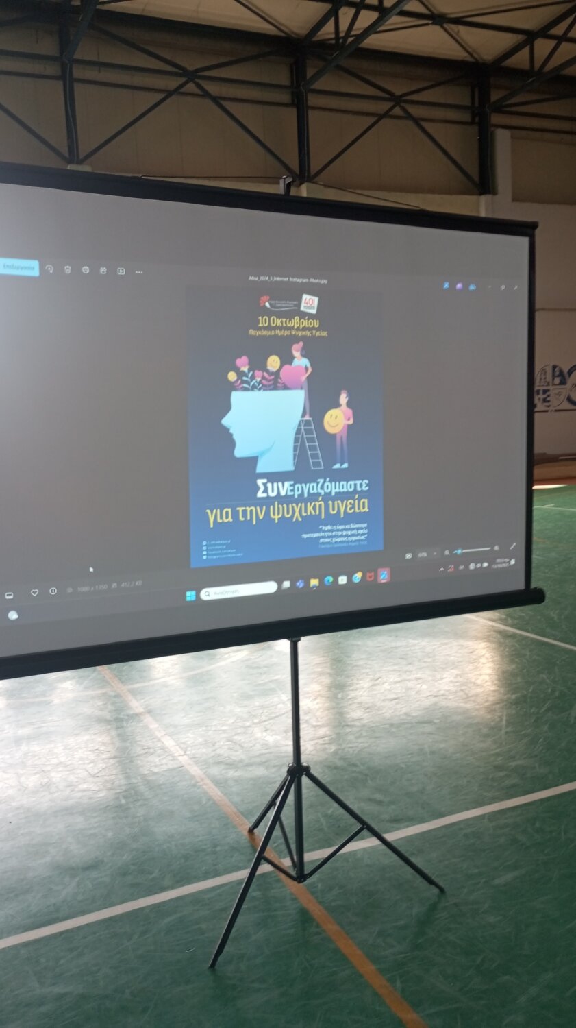 Τη Δευτέρα 13 Οκτωβρίου, πραγματοποιήθηκε στο 7ο Επαγγελματικό Λύκειο Λάρισας δράση με αφορμή την Παγκόσμια Ημέρα Ψυχικής Υγείας, με τη συμμετοχή όλων των μαθητών/μαθητριών και εκπαιδευτικών του σχολείου.