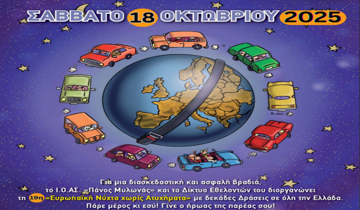 Τις δυνάμεις τους ενώνουν Δήμος Λαρισαίων, Δημοτικό Συμβούλιο Νεολαίας και Ινστιτούτο Οδικής Ασφάλειας (Ι.Ο.ΑΣ.) «Πάνος Μυλωνάς» για την υλοποίηση της δράσης «Νύχτα χωρίς Ατυχήματα» στη Λάρισα, το βράδυ του Σαββάτου, 18 Οκτωβρίου.