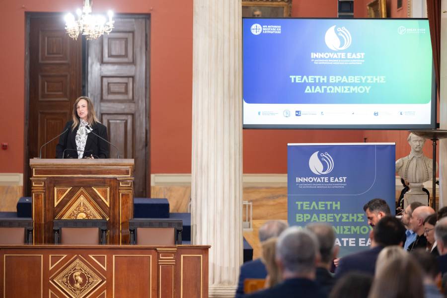 Με ιδιαίτερη επιτυχία πραγματοποιήθηκε την Τρίτη 7 Οκτωβρίου 2025 η Τελετή Βράβευσης του 1ου Διαγωνισμού Πράσινης και Γαλάζιας Καινοτομίας “Innovate East”, στην εμβληματική Μεγάλη Αίθουσα Τελετών του Εθνικού και Καποδιστριακού Πανεπιστημίου Αθηνών.