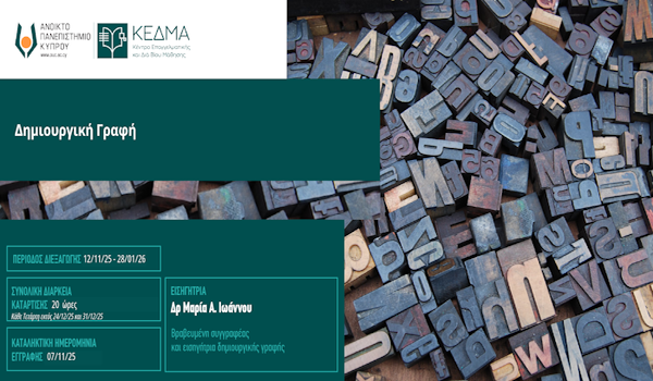 Το Κέντρο Επαγγελματικής και Διά Βίου Μάθησης (ΚΕΔΜΑ) του Ανοικτού Πανεπιστημίου Κύπρου (ΑΠΚΥ) διοργανώνει διαδικτυακό πρόγραμμα επιμόρφωσης με τίτλο «Πρόγραμμα Δημιουργικής Γραφής». Το Πρόγραμμα επιχορηγείται από την Αρχή Ανάπτυξης Ανθρώπινου Δυναμικού (ΑνΑΔ) της Κυπριακής Δημοκρατίας.