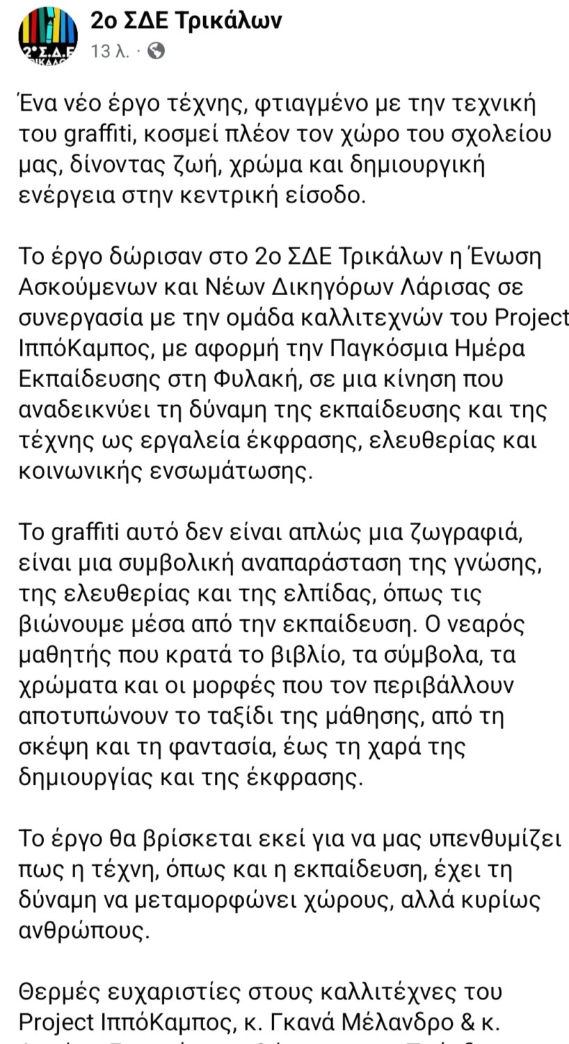 Εκεί δεν πήγαμε μόνοι, είχαμε μαζί μας τους καλλιτέχνες της ομάδας «project Ιππόκαμπος», οι οποίοι και ζωγράφισαν την πόρτα της εξόδου προς το προαύλιο. Ήταν ένα μικρό «δώρο» που θέλαμε να κάνουμε σε αυτούς τους ανθρώπους, δίνοντας λίγο χρώμα στο χώρο τους .. Το έργο θα βρίσκεται εκεί για να υπενθυμίζει σε όλους πως η τέχνη, όπως και η εκπαίδευση, έχει τη δύναμη να μεταμορφώνει χώρους, αλλά κυρίως ανθρώπους!