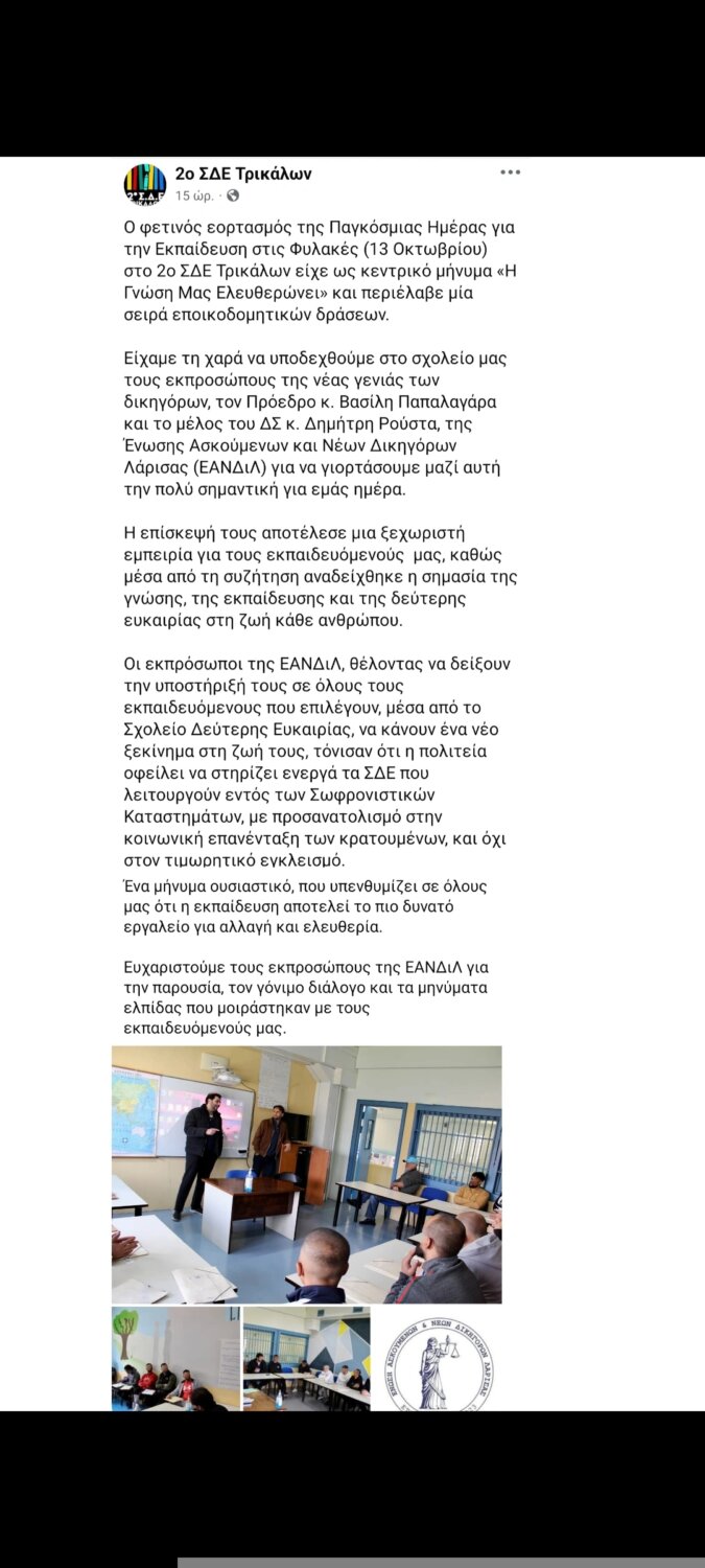 Κλείνοντας, ευχαριστούμε θερμά τον Διευθυντή Δομών Εκπαίδευσης και Κατάρτισης στο Σωφρονιστικό Κατάστημα Τρικάλων και Διευθυντή του 2ου Σχολείου Δεύτερης Ευκαιρίας Τρικάλων κ. Θεοφάνη Κατσάνο, όπως και όλη την ομάδα των εκπαιδευτικών του 2ου ΣΔΕ Τρικάλων, για τη ζέστη υποδοχή και την αγαστή συνεργασία».