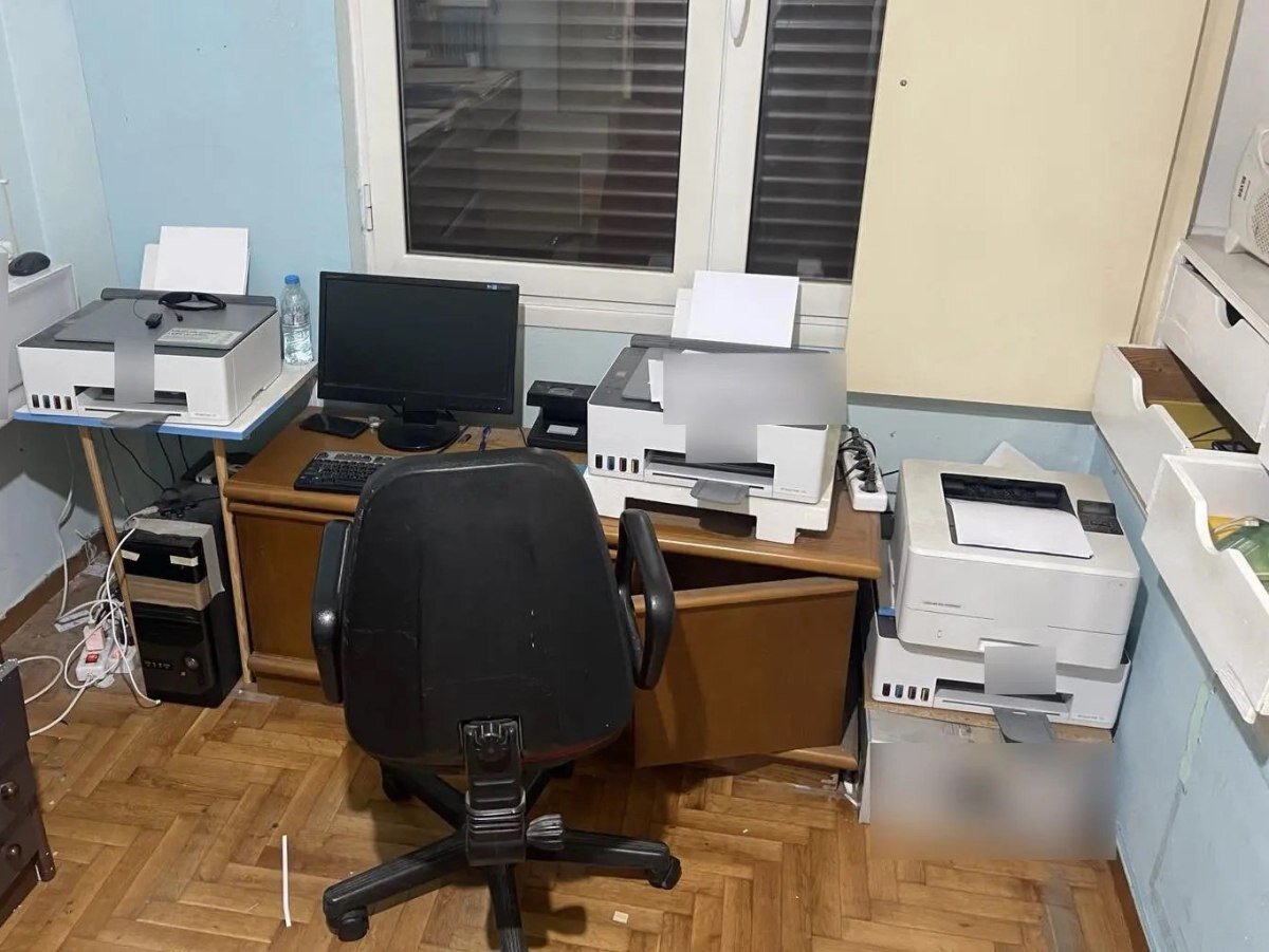 - εξοπλισμός, όπως -2- ηλεκτρονικοί υπολογιστές, -6- πολυμηχανήματα – εκτυπωτές, -2- πλαστικοποιητές – θερμοκολλητές, -4- επιτραπέζιοι κόφτες χειρός, ηλεκτρονική συσκευή εγχάραξης διαφανειών CNC, συσκευή ανίχνευσης πλαστών εγγράφων UV, -8- ρολά ιριδίζουσας ταινίας, πλήθος αφαιρούμενων ψηφιακών μέσων,