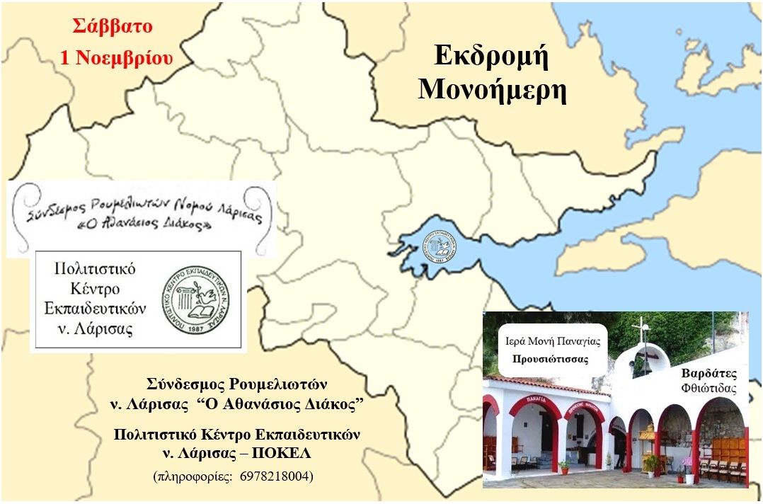 Ο Σύνδεσμος Ρουμελιωτών ν. Λάρισας «Ο Αθανάσιος Διάκος», με την υποστήριξη του Πολιτιστικού Κέντρου Εκπαιδευτικών νομού Λάρισας – ΠΟΚΕΛ διοργανώνει μονοήμερη εκδρομή στη Φθιώτιδα, το Σάββατο, 1 Νοεμβρίου 2025. Οι ενδιαφερόμενοι μπορούν να λάβουν πληροφορίες κι ενημέρωση στο κινητό τηλέφωνο: 6978218004.