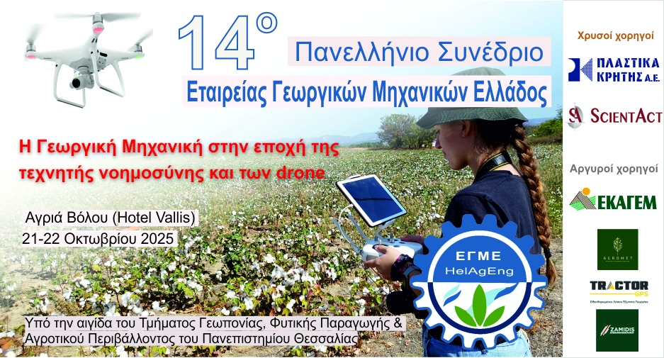Η Εταιρεία Γεωργικών Μηχανικών Ελλάδας (Ε.Γ.Μ.Ε.) μέλος της EurAgEng (Ευρωπαϊκή Εταιρεία Γεωργικών Μηχανικών) διοργανώνει το 14ο Πανελλήνιο Συνέδριο με θέμα: «Η Γεωργική Μηχανική στην εποχή της τεχνητής νοημοσύνης και των drone» Το Συνέδριο θα πραγματοποιηθεί στις 21 & 22 Οκτωβρίου 2025 στο ξενοδοχείο “Valis” στην Αγριά Βόλου, υπό την αιγίδα του Τμήματος Γεωπονίας, Φυτικής Παραγωγής & Αγροτικού Περιβάλλοντος του Πανεπιστημίου Θεσσαλίας.