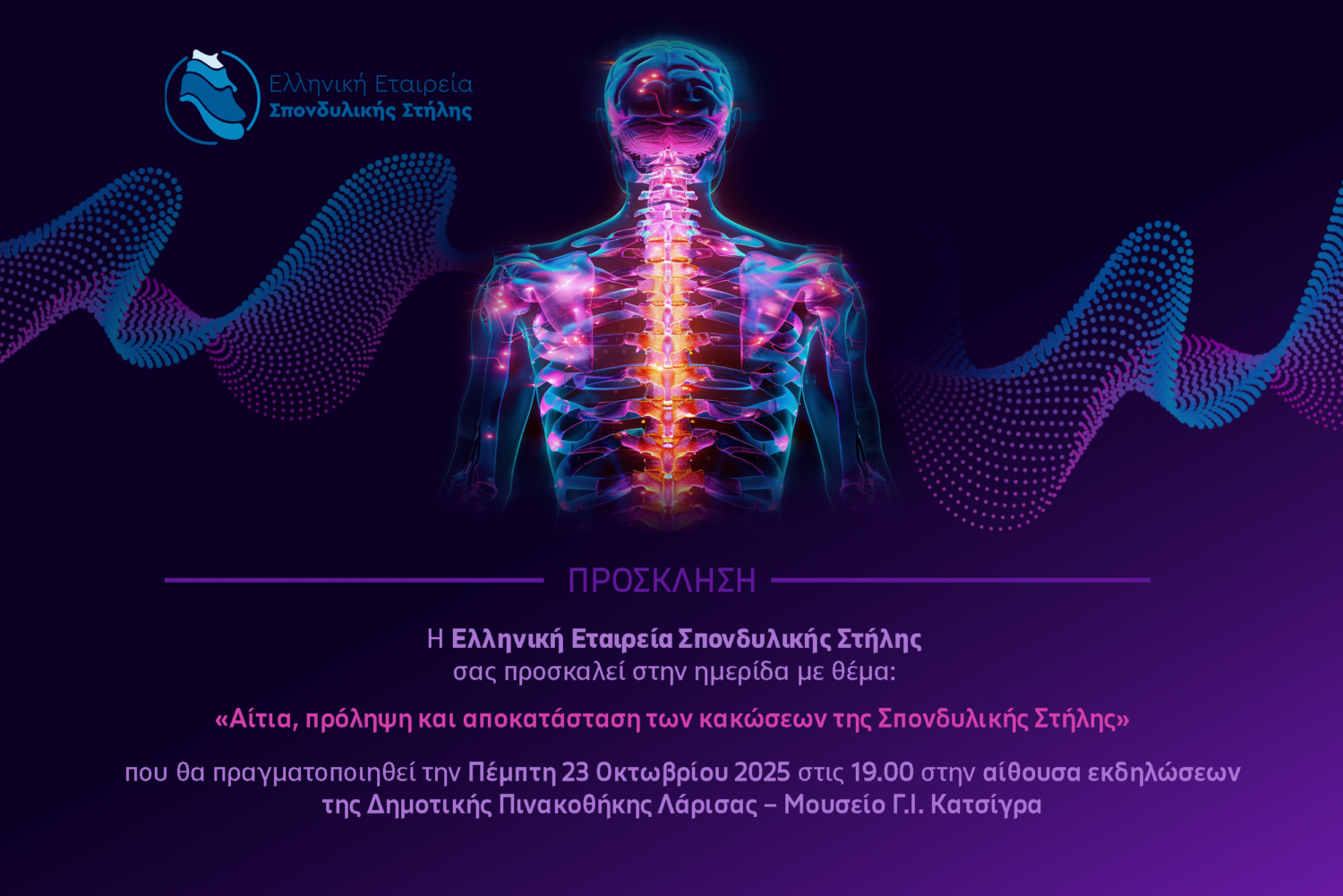 Στην Αίθουσα της Δημοτικής Πινακοθήκης – Μουσείο Γ.Ι. Κατσίγρα θα πραγματοποιηθεί την Πέμπτη 23 Οκτωβρίου η ενημερωτική εκδήλωση της Ελληνικής Εταιρείας Σπονδυλικής Στήλης για τα αίτια, τις πολιτικές πρόληψης και την αποκατάσταση των κακώσεων της Σπονδυλικής Στήλης. Η εκδήλωση που είναι ανοικτή στο κοινό, θα ξεκινήσει στις 7 το απόγευμα και φιλοδοξεί να φωτίσει τα αίτια που προκαλούν τις κακώσεις της σπονδυλικής στήλης και στις περισσότερες περιπτώσεις σχετίζονται με το μοτίβο των αστικών μετακινήσεων. Ωστόσο θα παρουσιαστούν επίσης οι σύγχρονες πρακτικές αντιμετώπισης και αποκατάστασης των σχετικών τραυμάτων, αλλά και οι πολιτικές πρόληψης.
