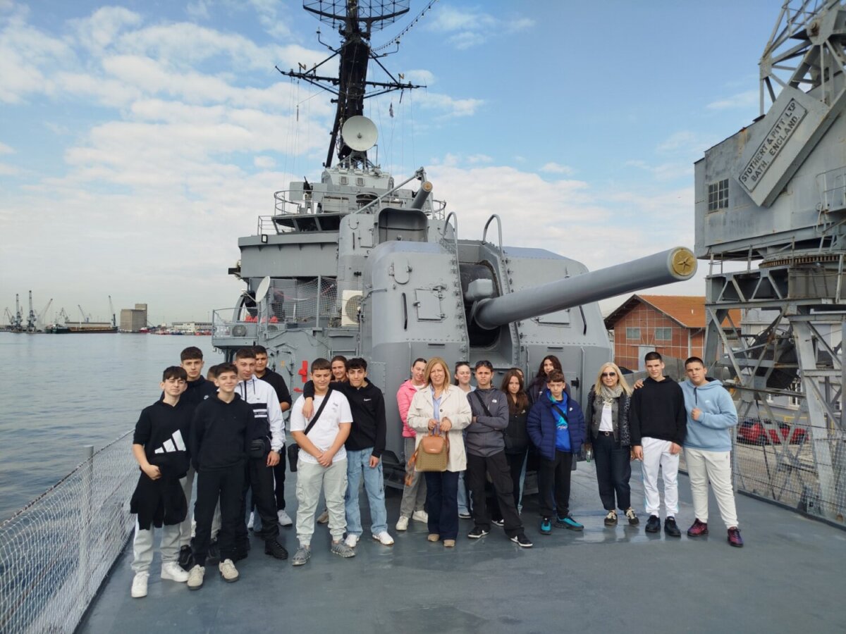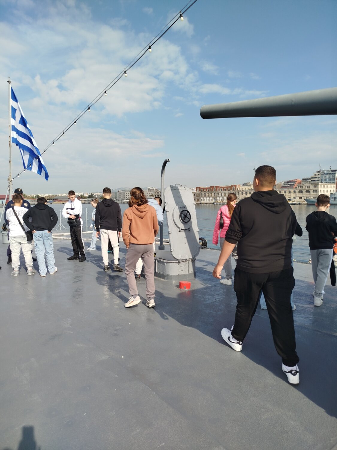 Κατά τη διάρκεια της επίσκεψης, οι μαθητές είχαν την ευκαιρία να περιηγηθούν στους χώρους του πλοίου και να γνωρίσουν από κοντά την πλούσια ιστορία του. Το Α/Τ «Βέλος» καθελκύστηκε το 1942 στα ναυπηγεία της Βοστώνης και εντάχθηκε το 1943 στο Πολεμικό Ναυτικό των ΗΠΑ, συμμετέχοντας ενεργά στον Ειρηνικό Ωκεανό κατά τον Β’ Παγκόσμιο Πόλεμο.