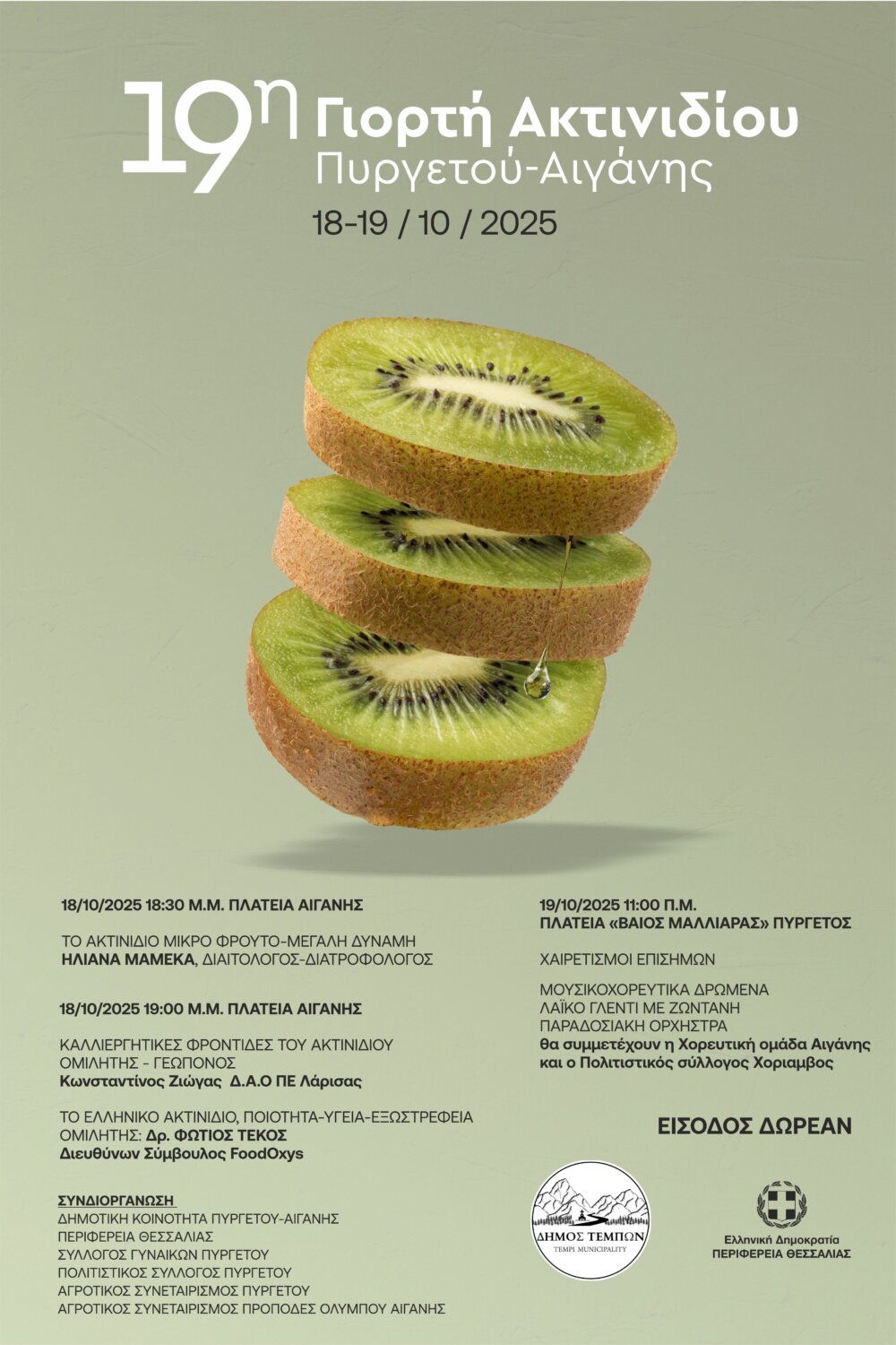 Σας περιμένουμε να επισκεφθείτε τον Δήμο Τεμπών, να δοκιμάσετε εδέσματα με βασικό συστατικό το ακτινίδιο και να γνωρίσετε από κοντά την Αιγάνη και τον Πυργετό — περιοχές όπου οι άνθρωποι, με κόπο και μεράκι, καλλιεργούν την ευλογημένη γη, παράγοντας ποιοτικά ακτινίδια που ταξιδεύουν σε Ευρώπη, Αμερική και την Ασία».