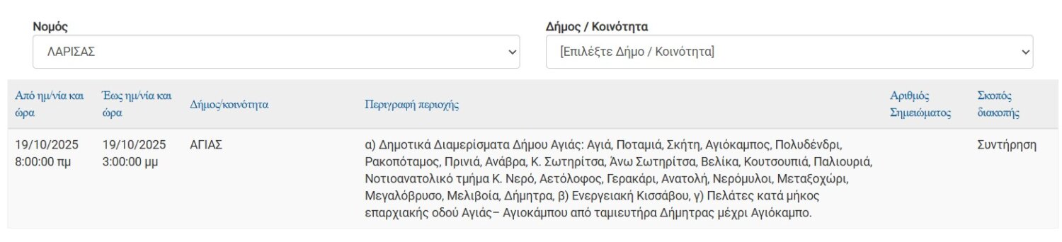 Σε προγραμματισμένες διακοπές στην παροχή ηλεκτρικού ρεύματος σε περιοχές της Περιφερειακής Ενότητας Λάρισας θα προχωρήσει σήμερα, Κυριακή 19 Οκτωβρίου 2025 ο ΔΕΔΔΗΕ Α.Ε.
