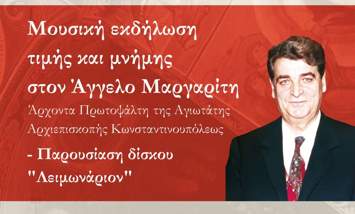 Εκδήλωση προς τιμήν του αείμνηστου Άρχοντα Πρωτοψάλτη της Αγιωτάτης Αρχιεπισκοπής Κωνσταντινουπόλεως Άγγελου Μαργαρίτη (Ιεροψάλτη Ι.Ν. Αγίων Κωνσταντίνου & Ελένης Λάρισας), με αφορμή την έκδοση του προσωπικού μουσικού δίσκου του «Λειμωνάριον», με επιλογή βυζαντινών ύμνων, θα πραγματοποηθεί την Κυριακή 2 Νοεμβρίου 2025 στις 19:00, στο Δημοτικό Ωδείο Λάρισας. Η εκδήλωση διοργανώνεται από την οικογένειά του σε συνεργασία με την Ιερά Μητρόπολη Λαρίσης & Τυρνάβου και την Αντιδημαρχία Πολιτισμού του Δήμου Λαρισαίων,