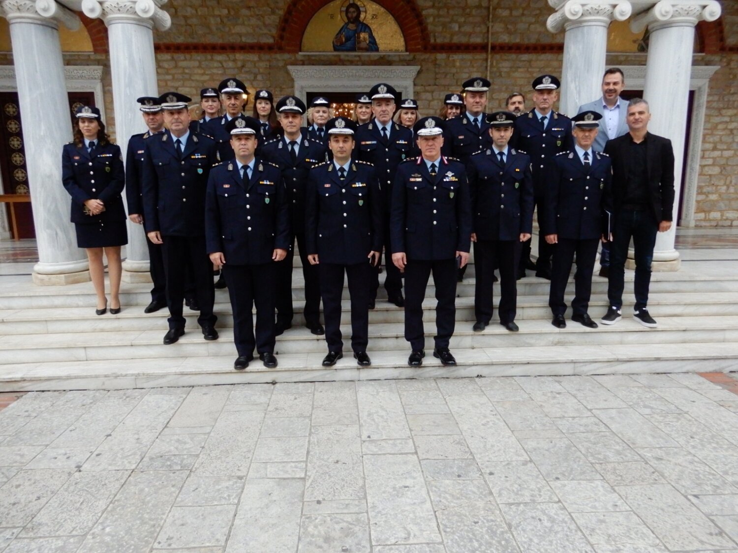 Τους προσκεκλημένους υποδέχτηκαν ο Γενικός Περιφερειακός Αστυνομικός Διευθυντής Θεσσαλίας, Ταξίαρχος Στυλιανός Μπιλιάλης, συνοδευόμενος από τον Διευθυντή Αστυνομίας Λάρισας, Αστυνομικό Διευθυντή Λοΐζο Παντικίδη, τους οποίους ευχαρίστησαν για την παρουσία τους.