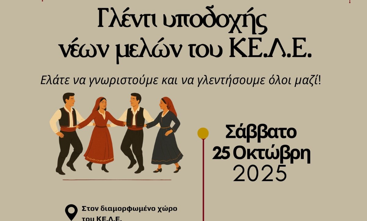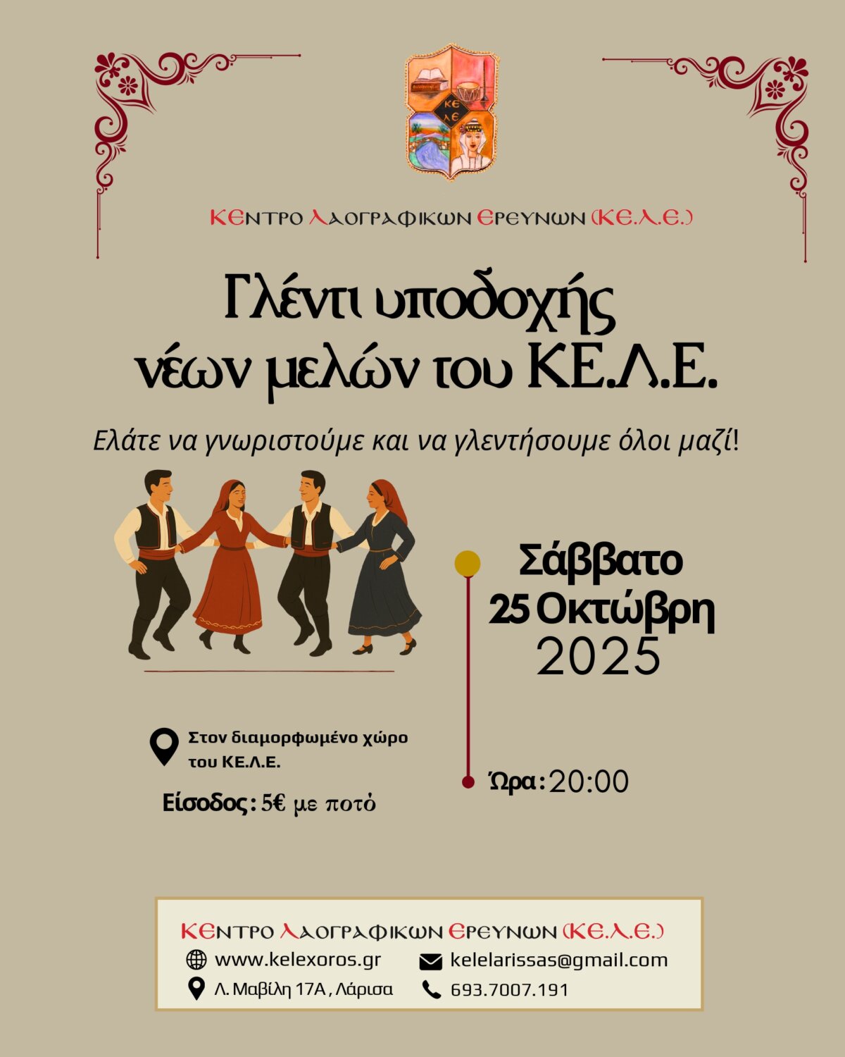 Το Κέντρο Λαογραφικών Ερευνών Λάρισας (ΚΕ.Λ.Ε.) «ανοίγει τη φετινή χορευτική χρονιά με τον πιο όμορφο και παραδοσιακό τρόπο – με ένα μεγάλο γλέντι υποδοχής νέων μελών το Σάββατο 25 Οκτωβρίου 2025, στις 20:00, στον φιλόξενο χώρο του (Λ. Μαβίλη 17Α, πίσω από το Δημοτικό Ωδείο Λάρισας).
