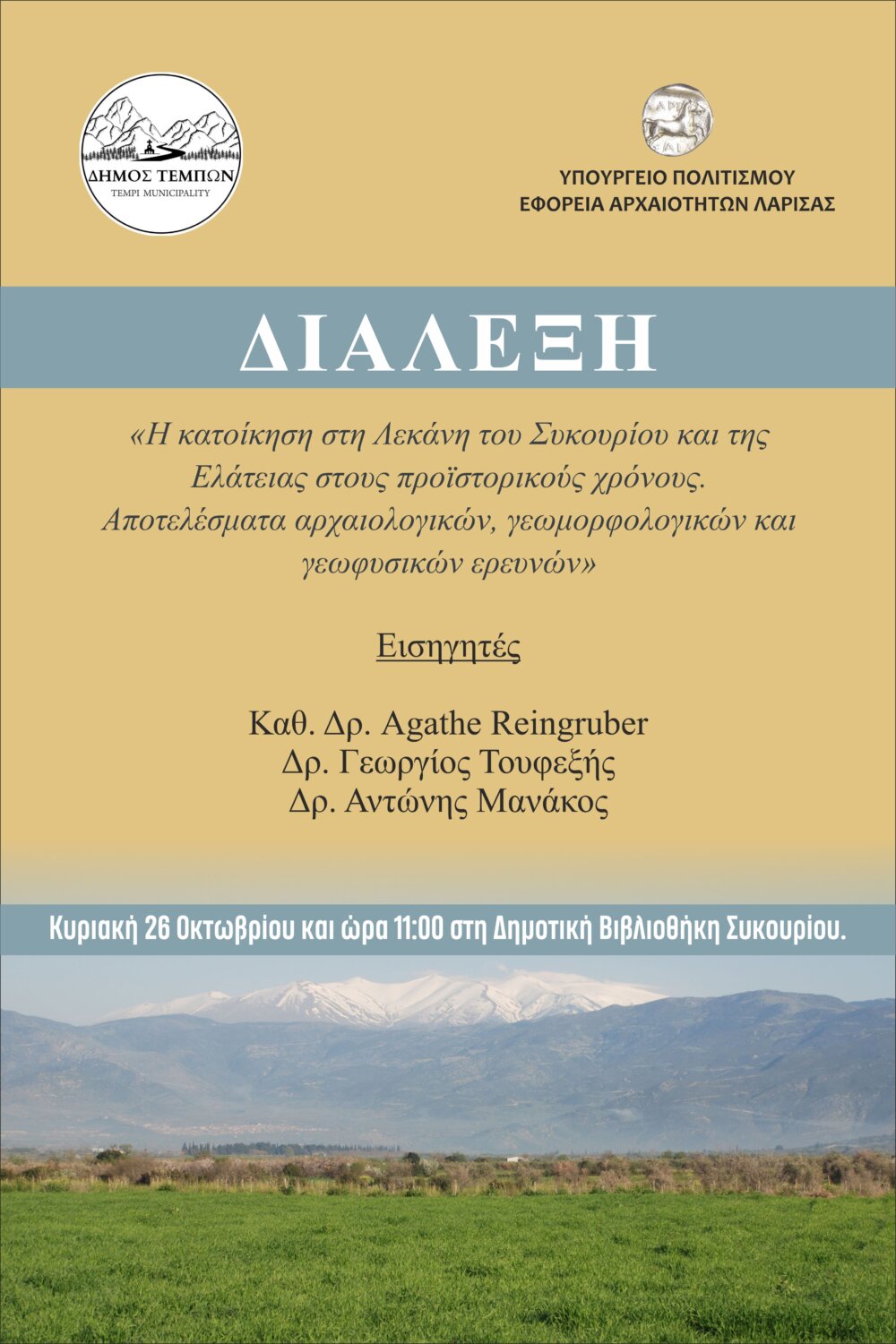 Ο Δήμος Τεμπών, σε συνεργασία με την Εφορεία Αρχαιοτήτων Λάρισας, διοργανώνει το Σάββατο 26 Οκτωβρίου 2025 και ώρα 11:00 π.μ., στη Δημοτική Βιβλιοθήκη Συκουρίου, διάλεξη με θέμα: