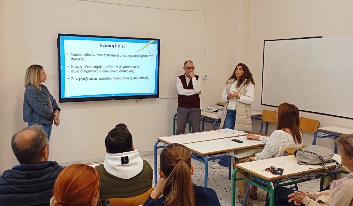 Οι Σύμβουλοι Σχολικής Ζωής, Μπακαλούλη Ευαγγελία και Υψηλός Κωνσταντίνος ετοίμασαν μια παρουσίαση κι ενημέρωσαν τους γονείς για τον ρόλο τους, καθώς και για τον σχολικό εκφοβισμό, την ηλεκτρονική πλατφόρμα «stop bullying», αλλά και άλλους θεσμούς που συμβάλλουν στη δημιουργία ενός ασφαλούς σχολείου. Η ψυχολόγος Τασιοπούλου Χριστίνα και η κοινωνική λειτουργός Βασιλείου Μαρία, ανέλυσαν τα καθήκοντα και τον τρόπο λειτουργίας της Ε.Δ.Υ., της οποίας αποτελούν μέλη. Επίσης, προβλήθηκε υλικό από τις περσινές δράσεις, τις εκπαιδευτικές επισκέψεις στο πλαίσιο των Σχολικών Εκπαιδευτικών Προγραμμάτων, τις εκδηλώσεις – γιορτές του σχολείου και τη θεατρική ομάδα, από τον υποδιευθυντή Σακατζή Δημήτριο.