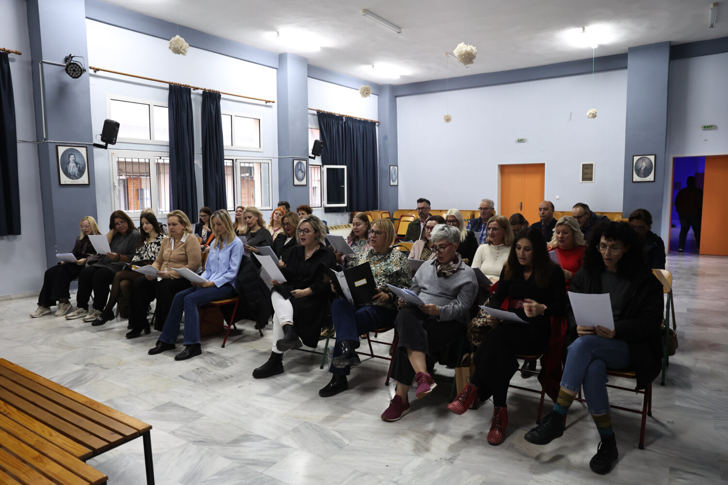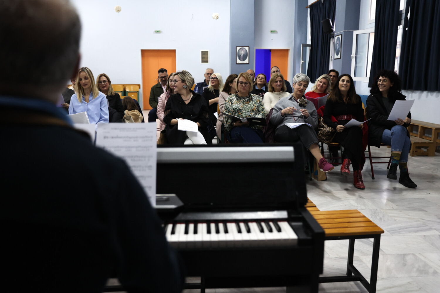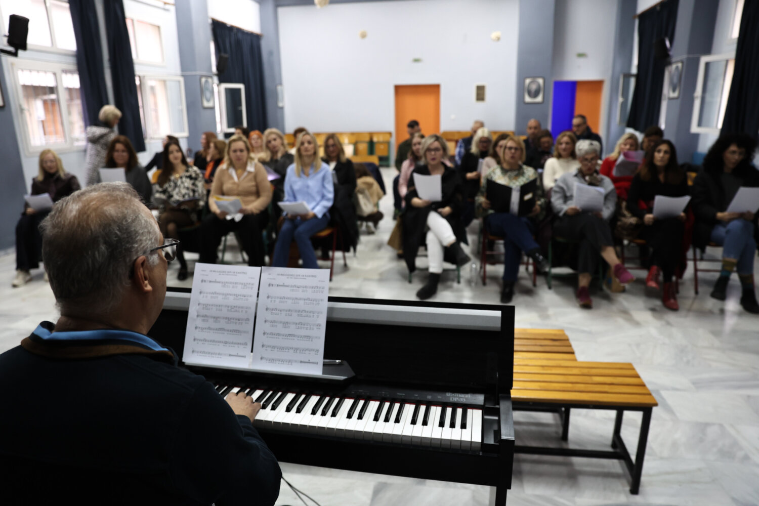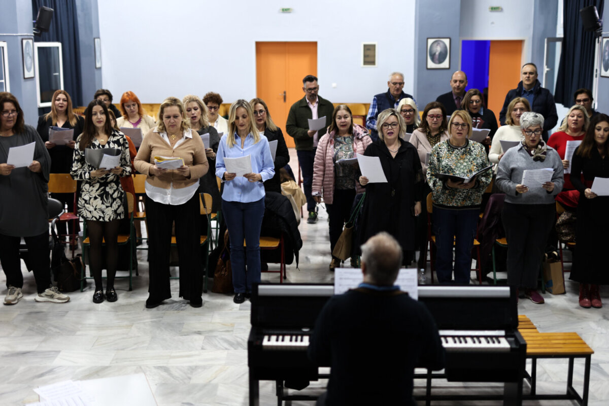 Την στιγμή που ανεβαίνουμε στην αίθουσα εκδηλώσεων του 2ου δημοτικού σχολείου όπου διεξάγονται κάθε Παρασκευή οι πρόβες από τις 5 μέχρι τις 6.30 μ.μ, τα μέλη της χορωδίας ερμηνεύουν την κλασική επιτυχία του Μίμη Πλέσσα “Οι θαλασσιές σου οι χάντρες” υπο τις επευφημίες μάλιστα του μαέστρου Χρήστου Κτιστάκη.