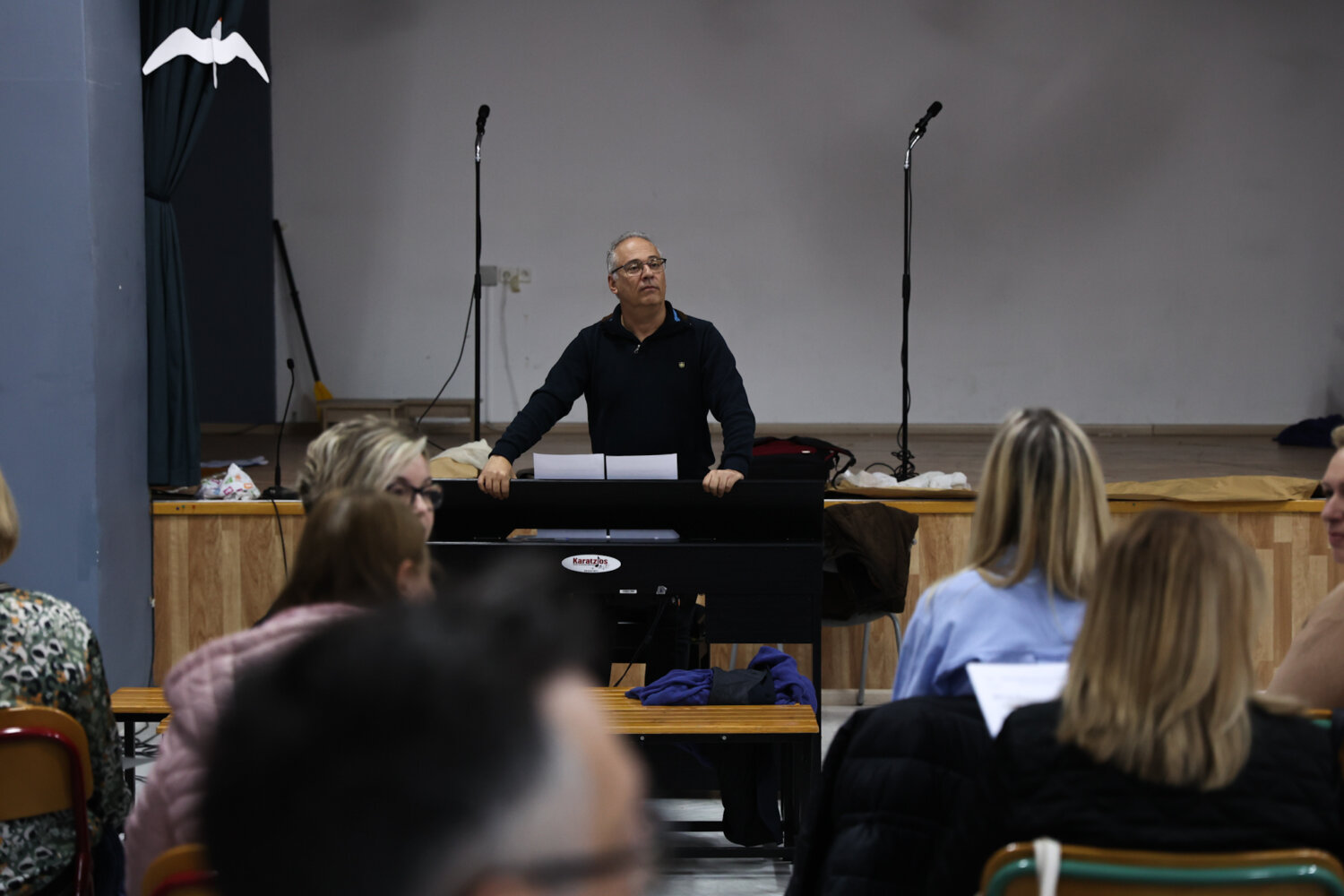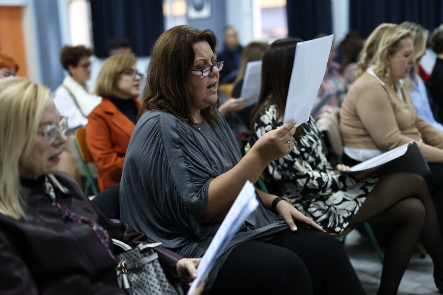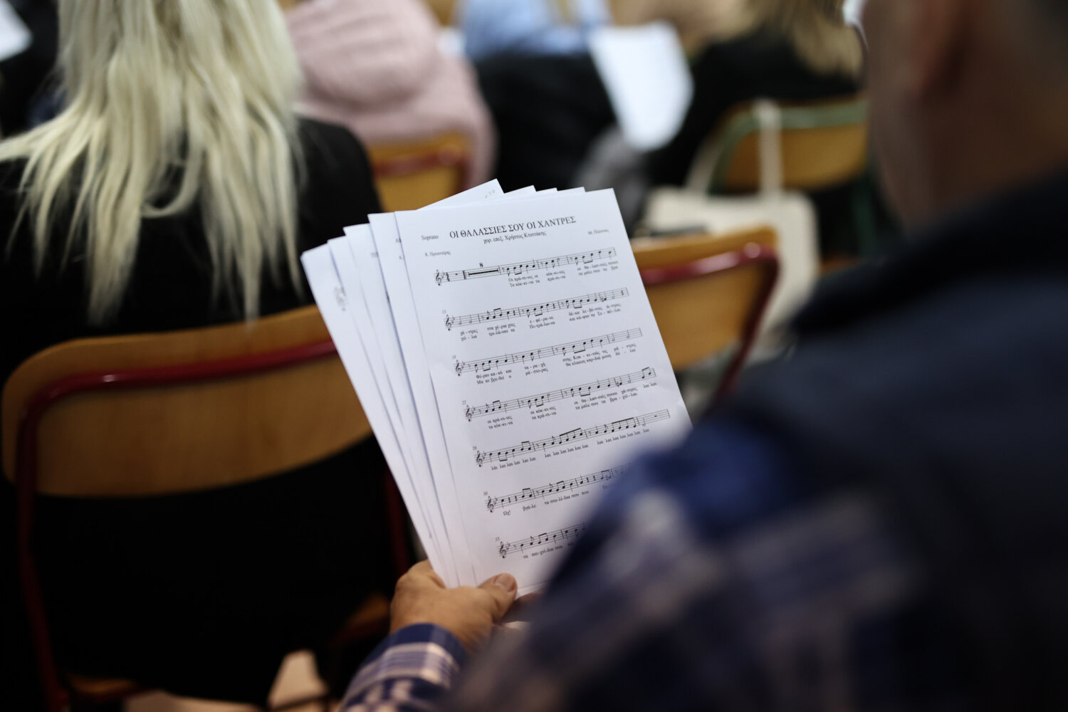 Την στιγμή που ανεβαίνουμε στην αίθουσα εκδηλώσεων του 2ου δημοτικού σχολείου όπου διεξάγονται κάθε Παρασκευή οι πρόβες από τις 5 μέχρι τις 6.30 μ.μ, τα μέλη της χορωδίας ερμηνεύουν την κλασική επιτυχία του Μίμη Πλέσσα “Οι θαλασσιές σου οι χάντρες” υπο τις επευφημίες μάλιστα του μαέστρου Χρήστου Κτιστάκη.