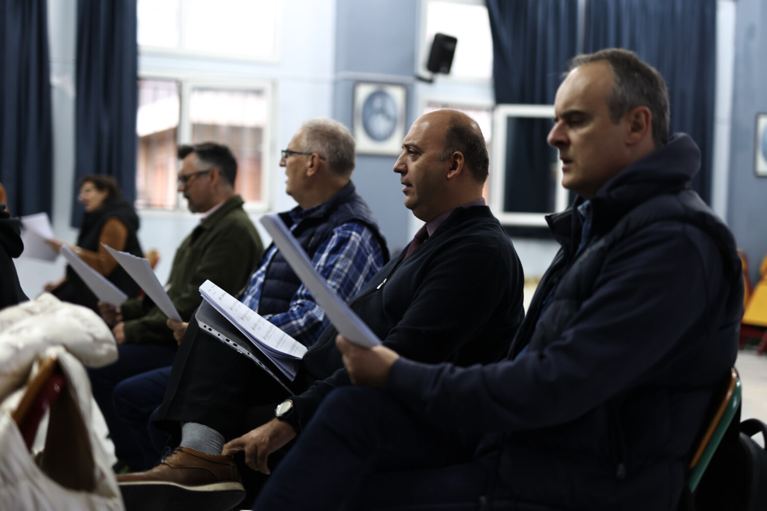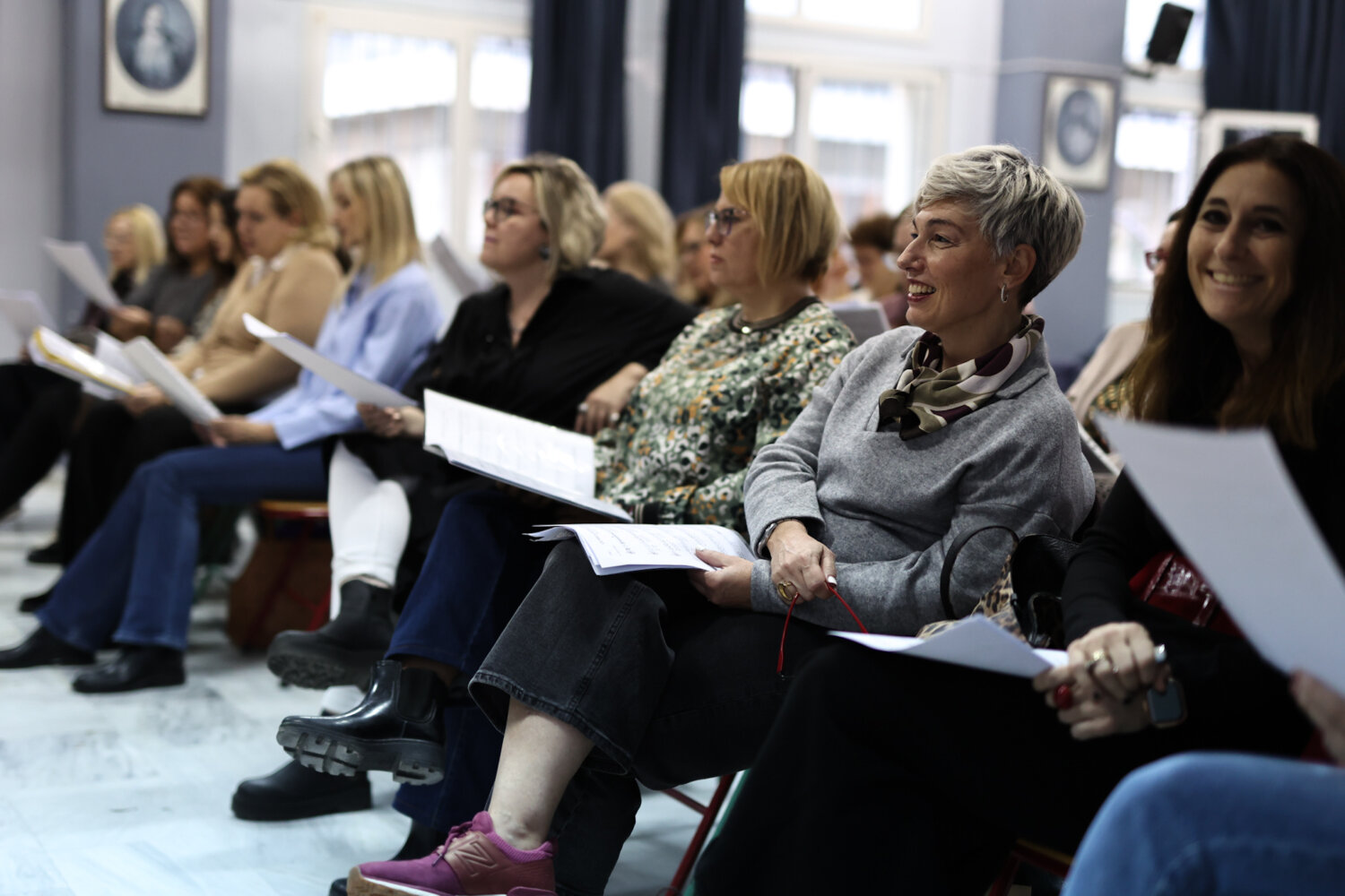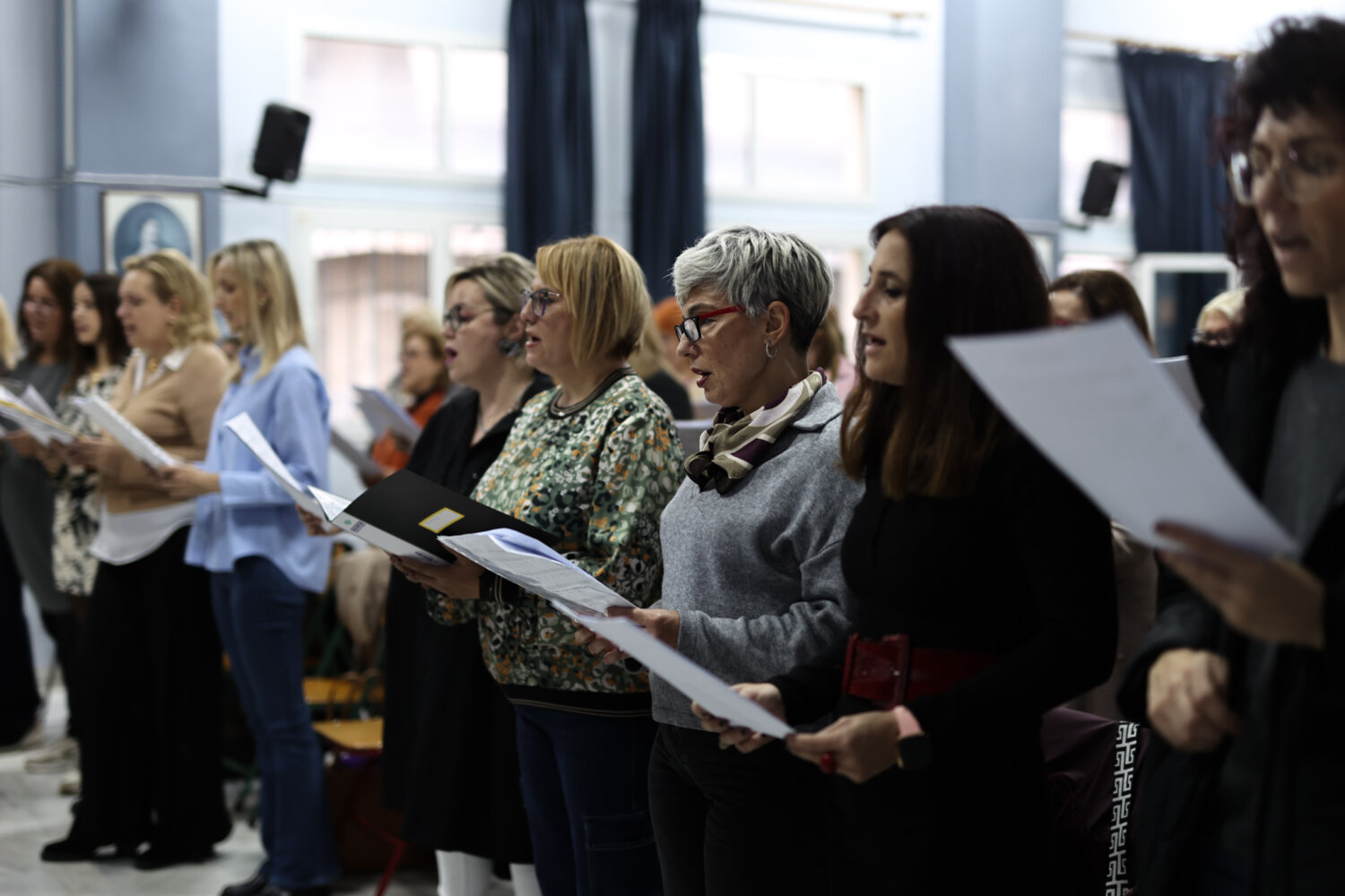 Λίγο πριν τις 18.30 η πρόβα πλησιάζει στο τέλος της. Εκτός από τα κλασσικά ελληνικά τραγούδια, η χορωδία “ζεσταίνεται” και με γνωστές χριστουγεννιάτικες επιτυχίες για να ολοκληρωθεί η σημερινή πρόβα για ακόμα μια φορά με το “Οι θαλασσιές σου οι χάντρες”.