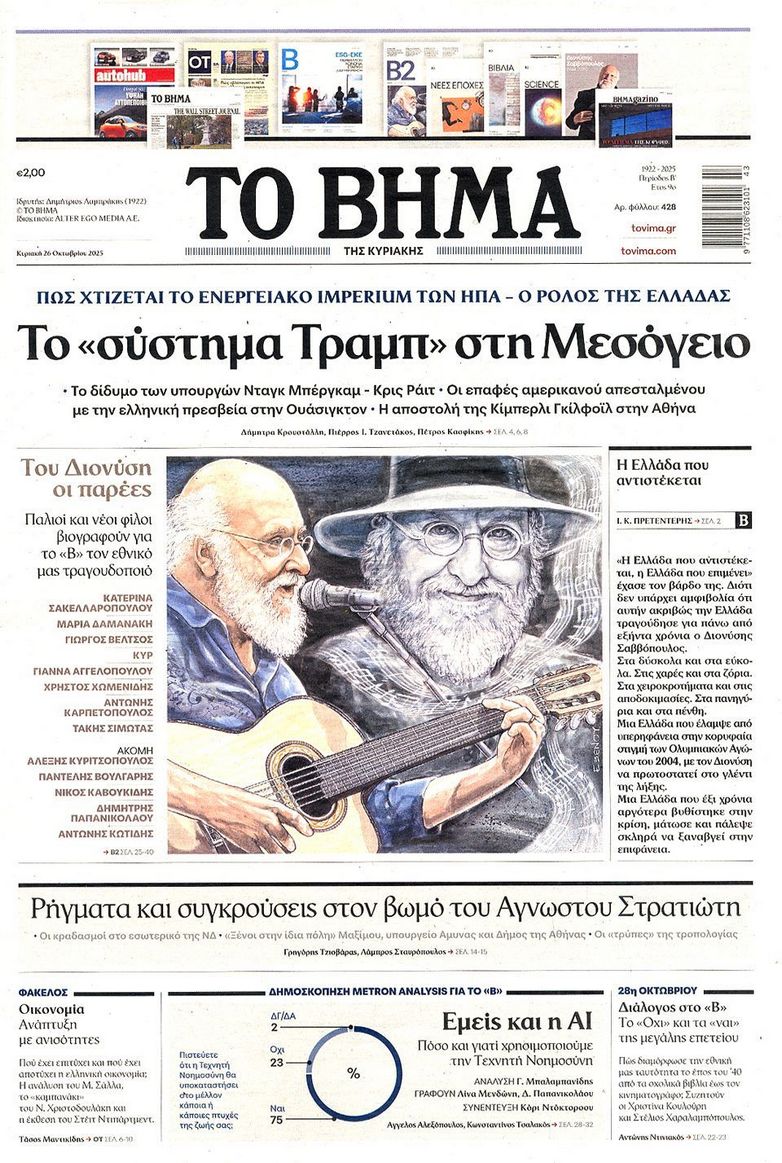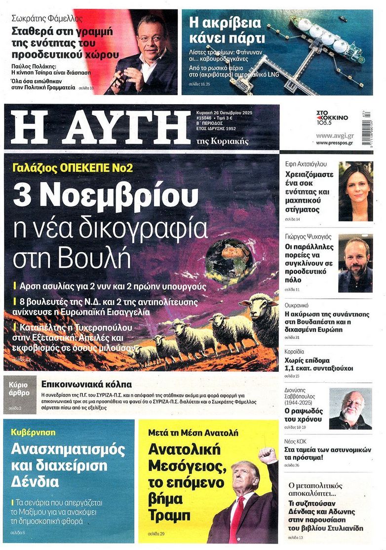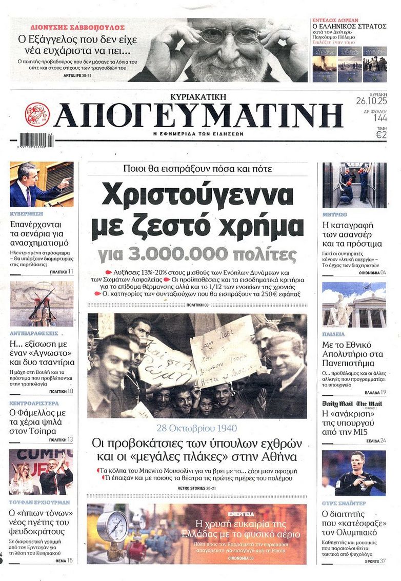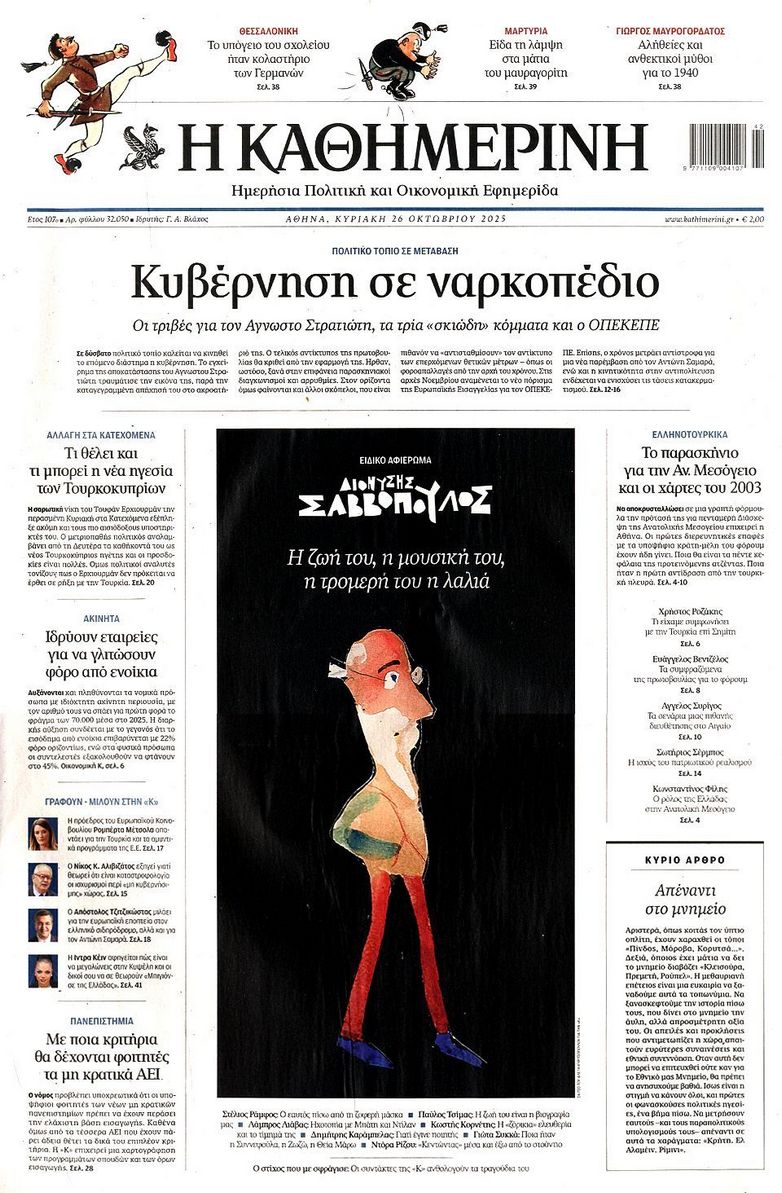 Τα αφιερώματα στο σπουδαίο τραγουδοποιό Διονύση Σαββόπουλο ο οποίος έφυγε από την ζωή την περασμένη Τρίτη, το πολιτικό τοπίο που καλείται να αντιμετωπίσει η κυβέρνηση με τις τριβές για τον «Άγνωστο Στρατιώτη» τα τρία σκιώδη κόμματα και τον ΟΠΕΚΕΠΕ και η φημολογούμενη εμπλοκή του Ντόναλντ Τραμπ στο Κυπριακό ξεχωρίζουν στα πρωτοσέλιδα των κυριακάτικων εφημερίδων.