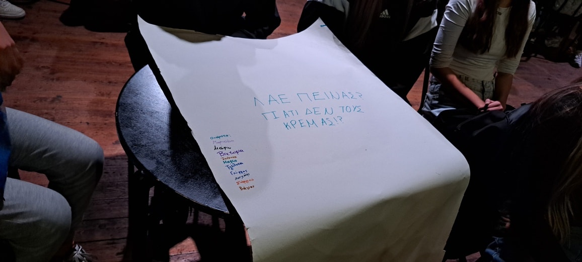 Η Αγλαΐα Νάκα (σχεδιασμός – εμψύχωση), ο Σπύρος Καβαλλιεράτος (κιθάρα, τραγούδι) και ο Γιώργος Κατσάρας (κρουστά) παρουσίασαν μια σύγχρονη, συμμετοχική παράσταση, όπου ο/η θεατής/τρια δεν μένει απλός παρατηρητής, αλλά γίνεται μέρος της αφήγησης, της δράσης και του ίδιου του τέλους της ιστορίας.
