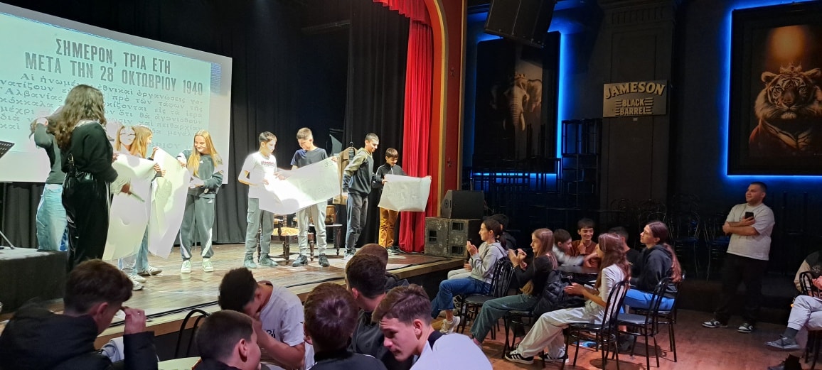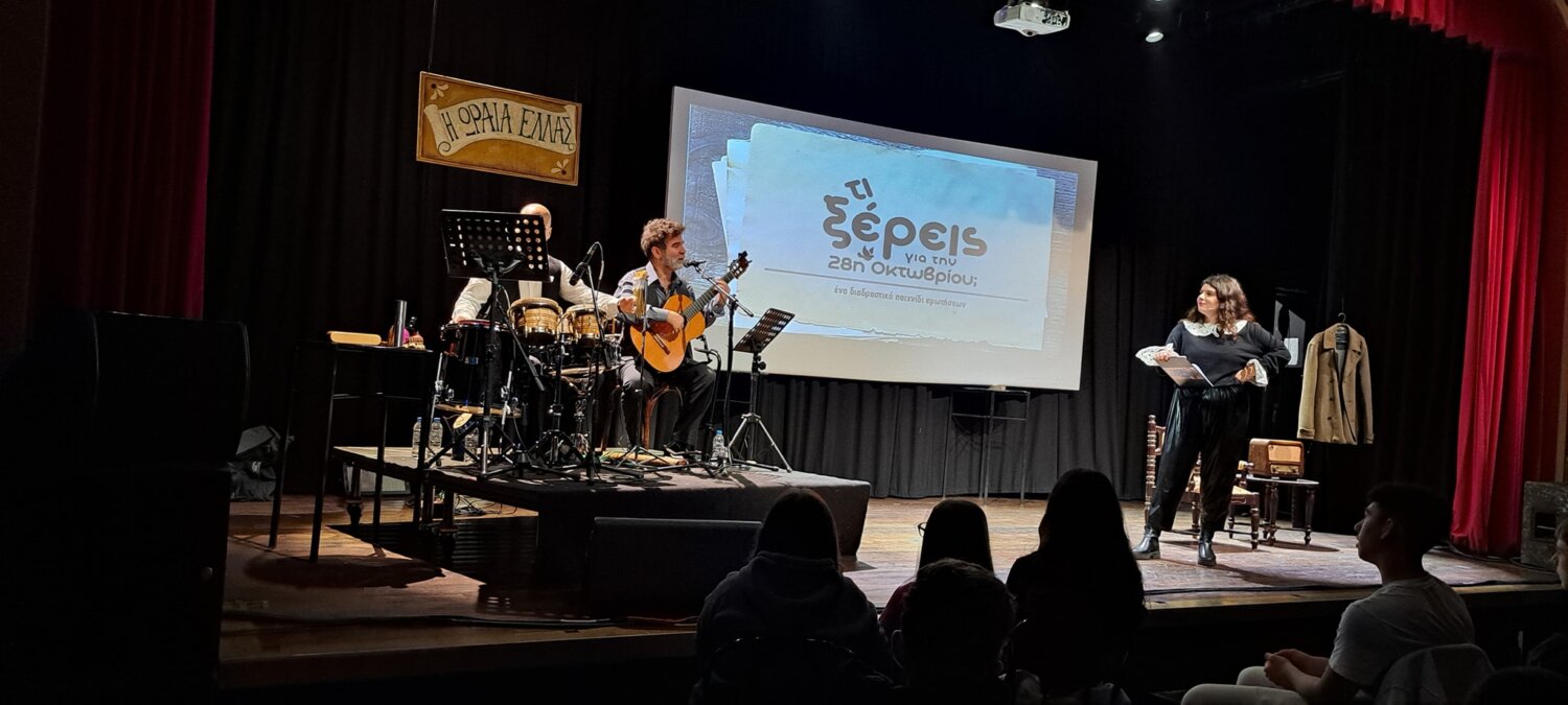 Με αφορμή τον εορτασμό της 23ης Οκτωβρίου, ημέρα απελευθέρωσης της Λάρισας, τα τμήματα Β1 και Β3 του 5ου Γυμνασίου Λάρισας παρακολούθησαν την πρωτότυπη μουσικοθεατρική παράσταση για τη μνήμη και την Ιστορία: «Τι ξέρεις για την 28η Οκτωβρίου».
