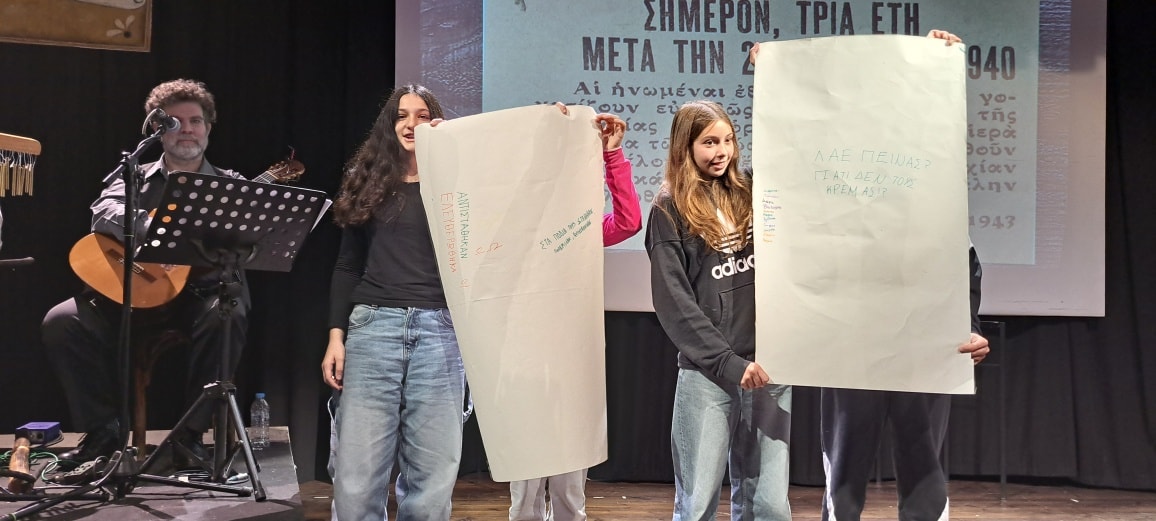 Με αφετηρία το ιστορικό πλαίσιο της περιόδου 1940–1945, οι δημιουργοί της παράστασης προσκάλεσαν τους μαθητές και τις μαθήτριες σε ένα διαδραστικό ταξίδι μνήμης, με ζωντανή μουσική, ερωτήσεις, παιχνίδι και βιωματικές δραστηριότητες. Η Ιστορία «πήρε ζωή» και μετατράπηκε σε εμπειρία, κάνοντας τα παιδιά να προσεγγίσουν το παρελθόν όχι ως κάτι μακρινό και στατικό, αλλά ως μια ζωντανή διαδικασία που εμπνέει και συνδέεται ουσιαστικά με το σήμερα.