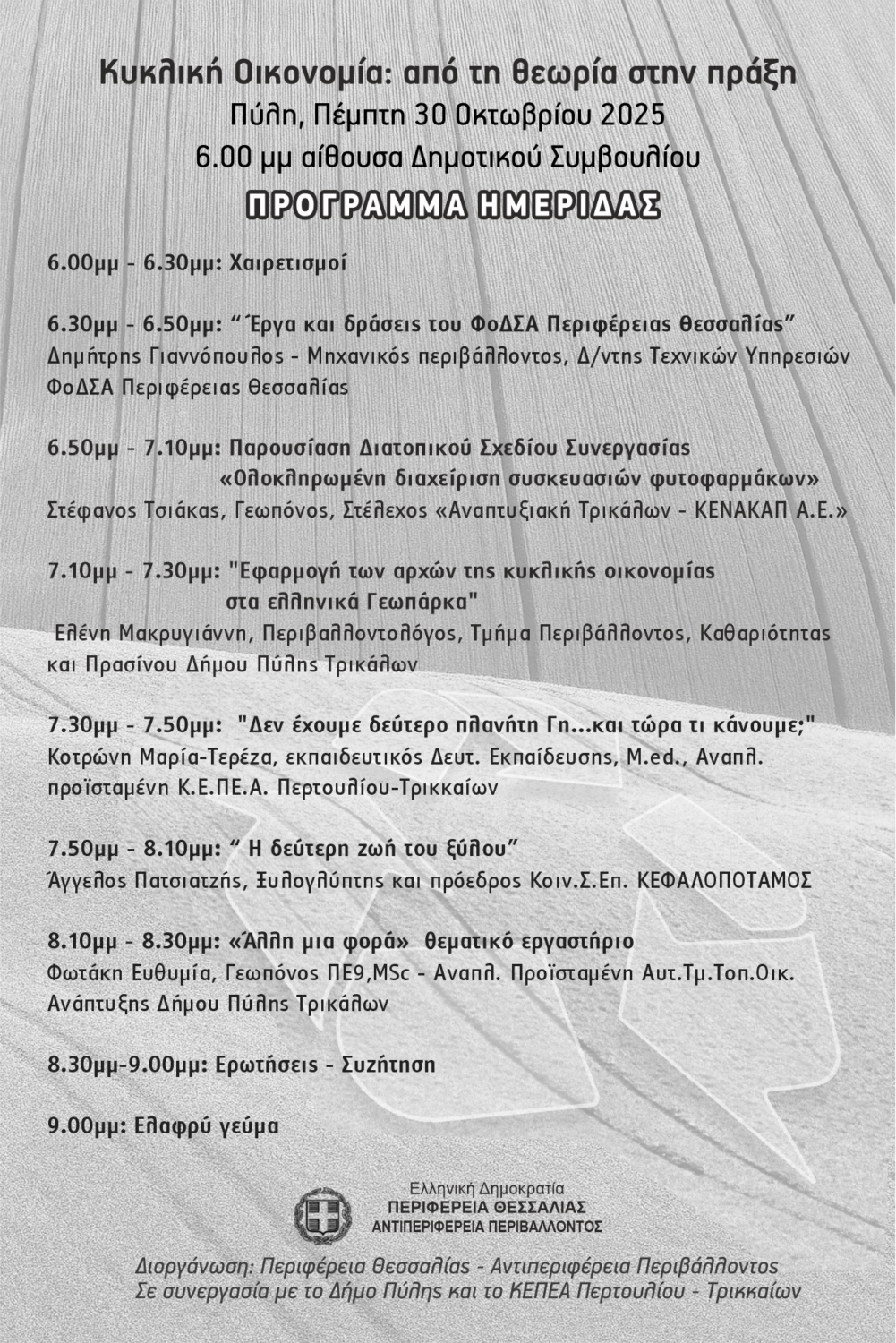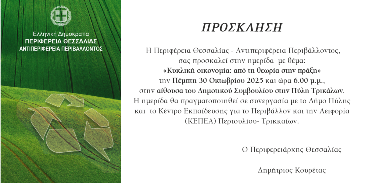 Η Περιφέρεια Θεσσαλίας – Αντιπεριφέρεια Περιβάλλοντος, σε συνεργασία με τον Δήμο Πύλης και το Κέντρο Εκπαίδευσης για το Περιβάλλον και την Αειφορία (ΚΕΠΕΑ) Περτουλίου–Τρικκαίων, διοργανώνει ημερίδα με θέμα: «Κυκλική οικονομία: από τη θεωρία στην πράξη», την Πέμπτη 30 Οκτωβρίου και ώρα 6:00 μ.μ., στην αίθουσα του Δημοτικού Συμβουλίου Πύλης, Τρικάλων.