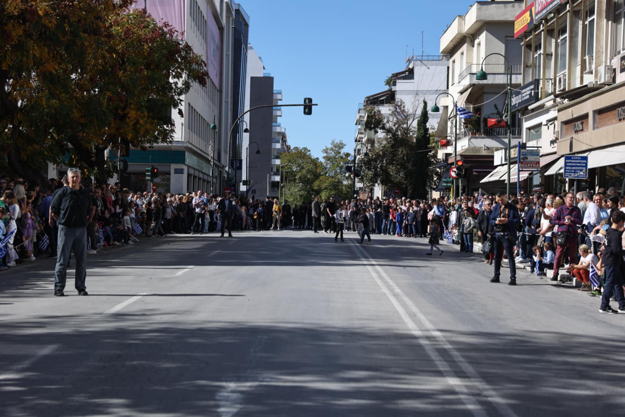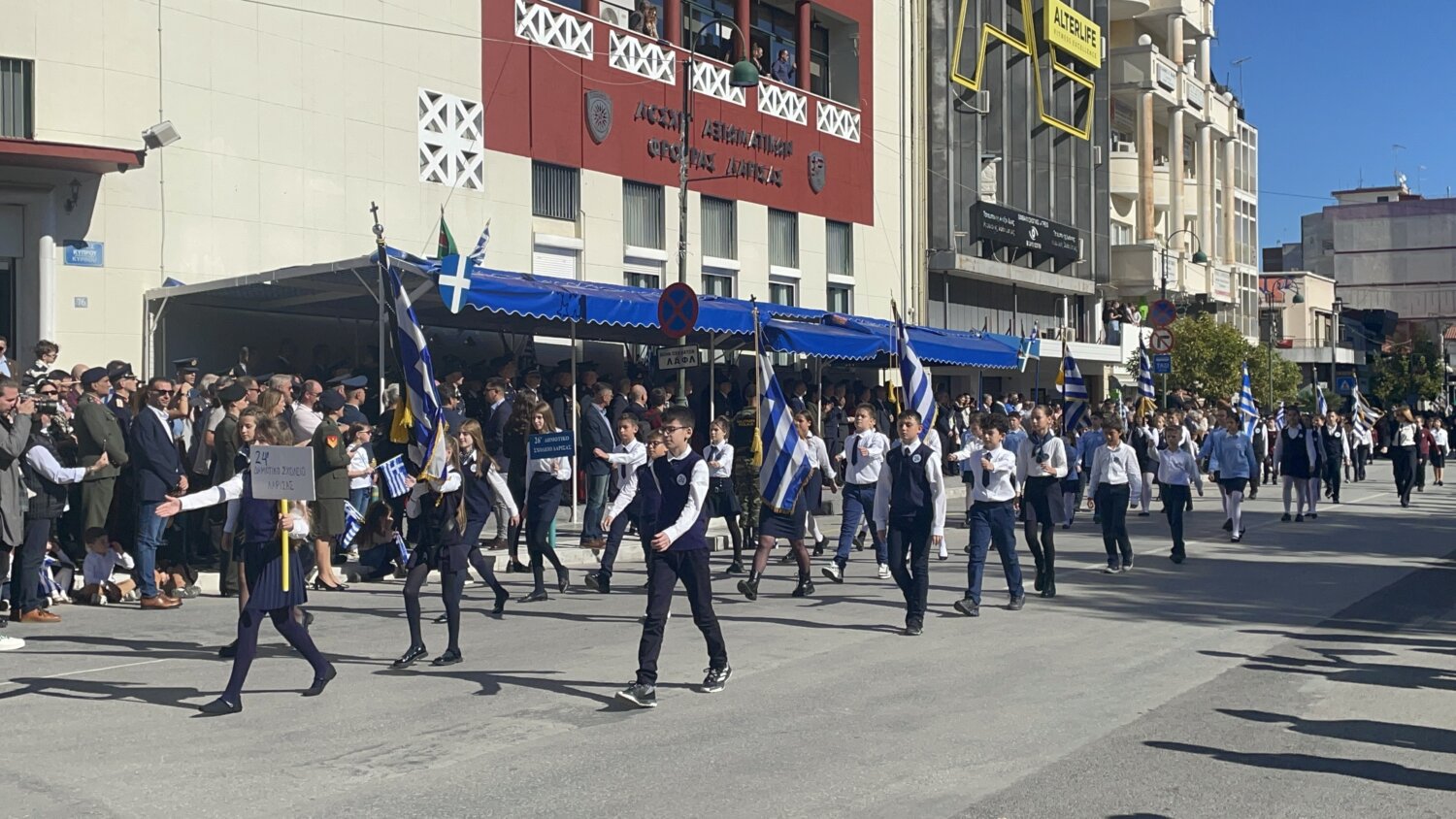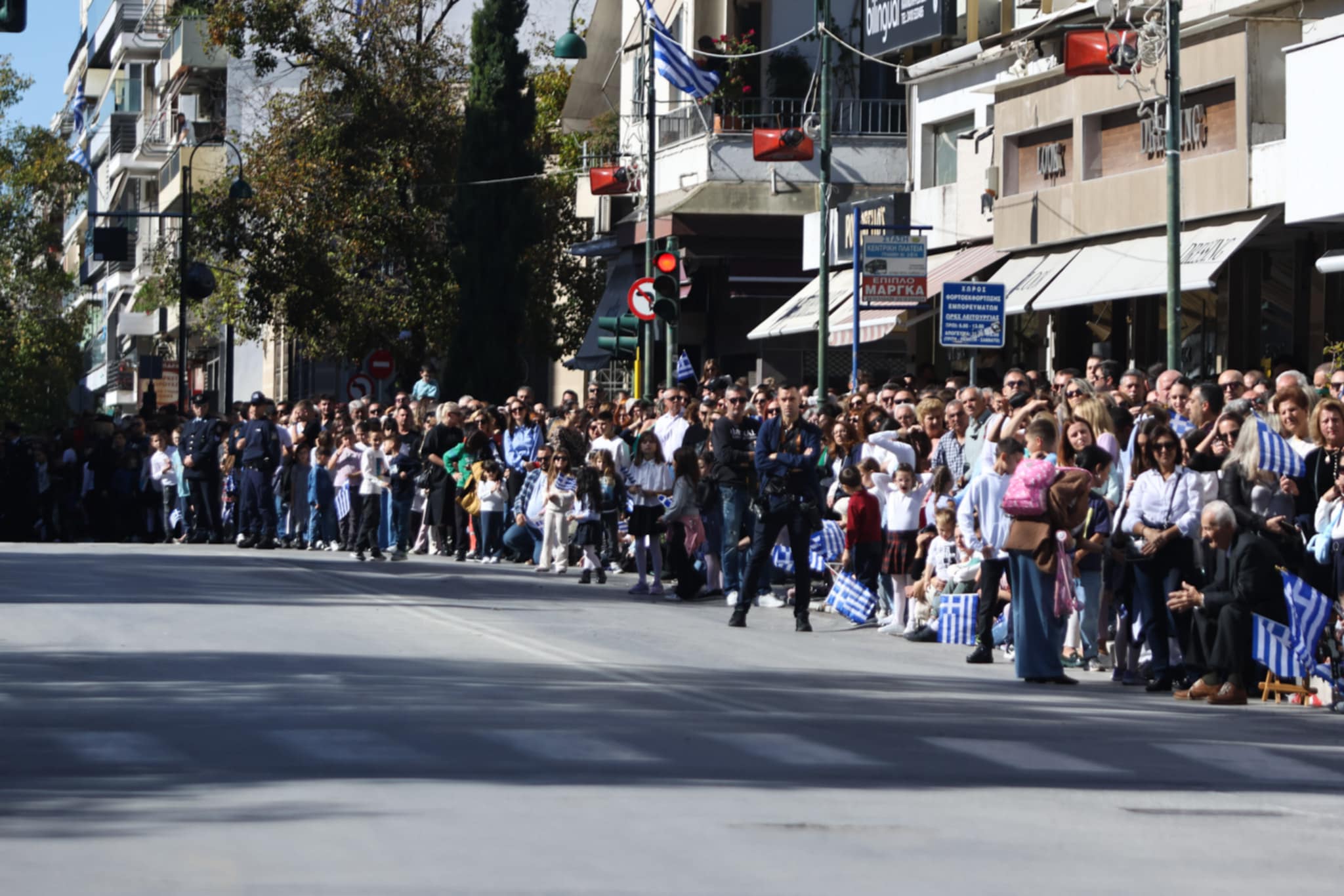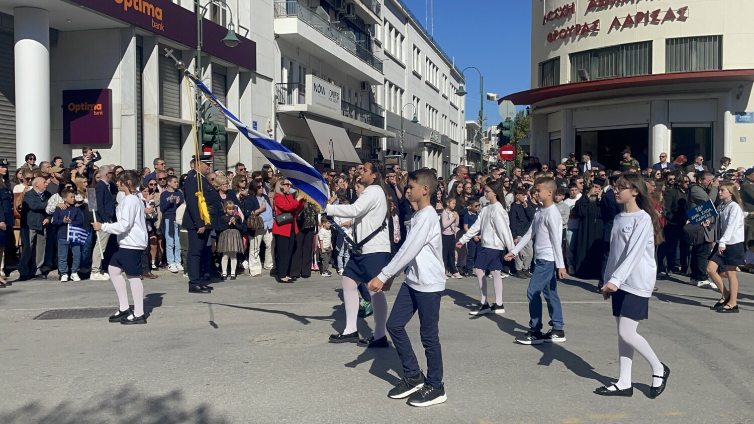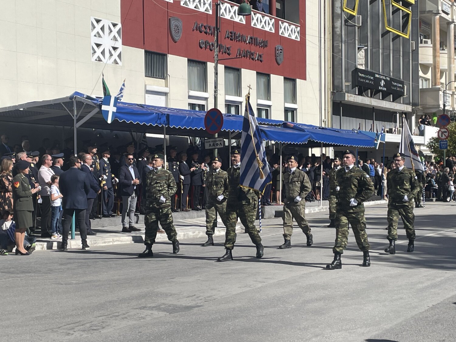 Πλήθος κόσμου έχει κατακλύσει την κεντρική πλατεία της Λάρισας και παρακολουθεί την παρέλαση.