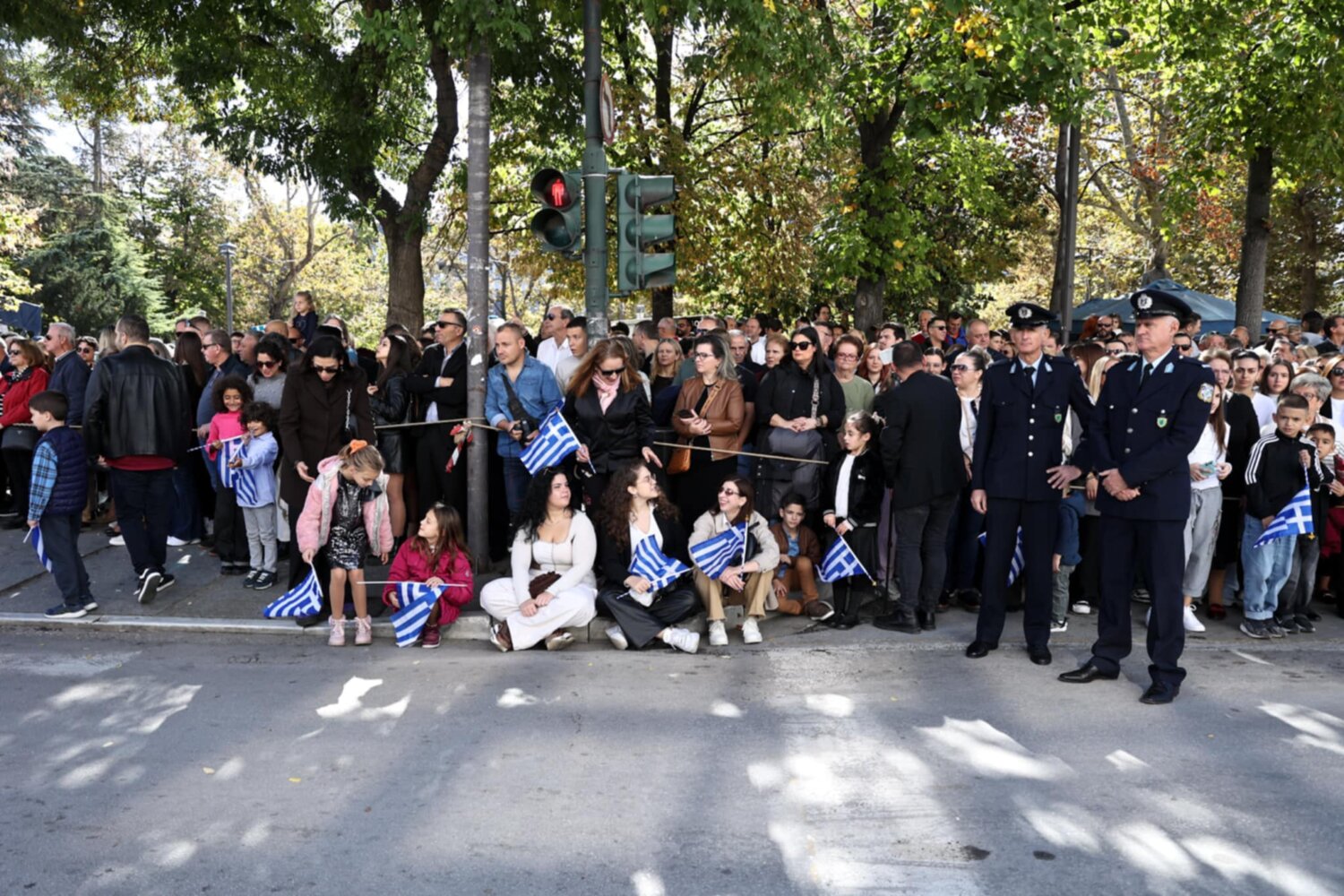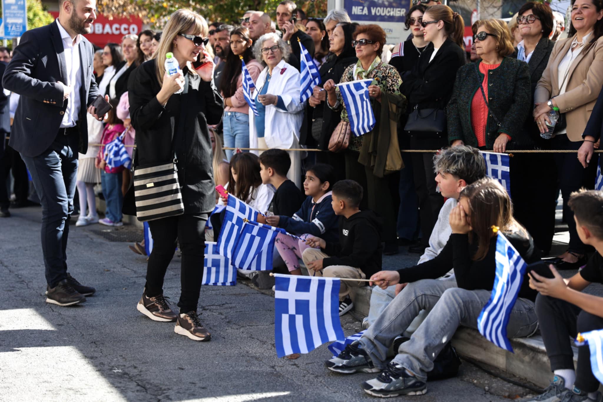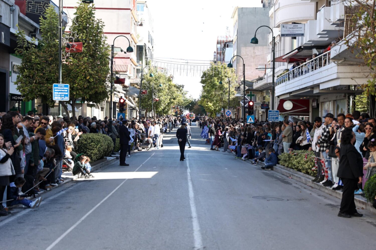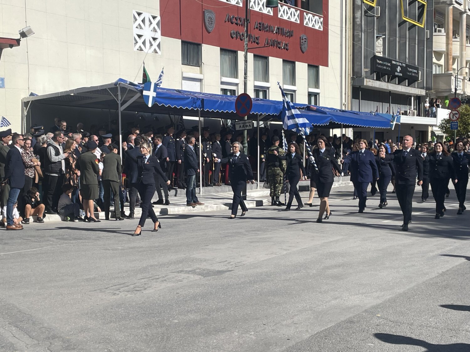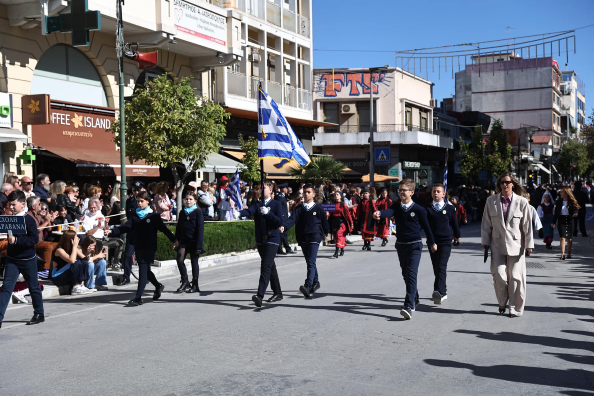 Πλήθος κόσμου έχει κατακλύσει την κεντρική πλατεία της Λάρισας και παρακολουθεί την παρέλαση.