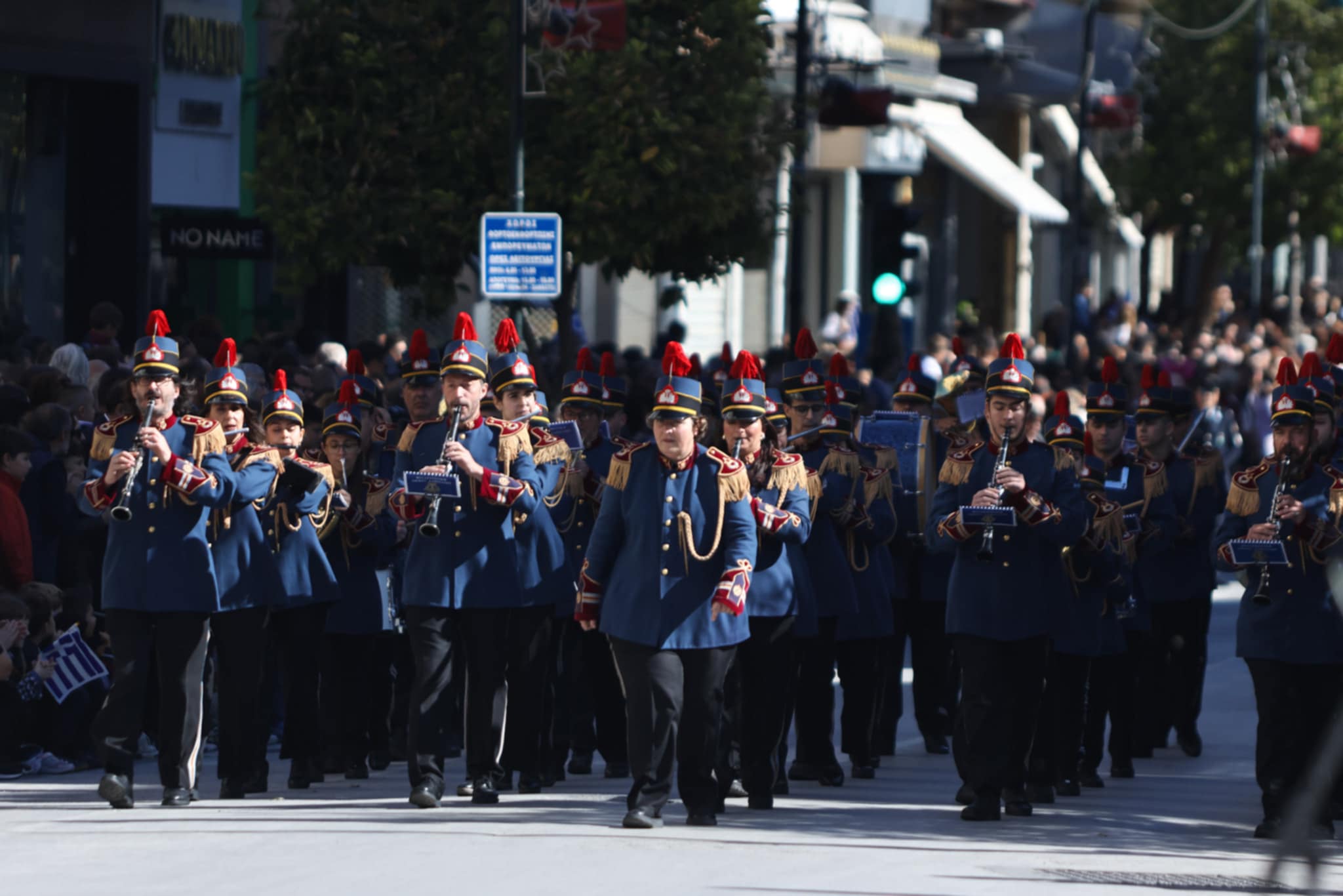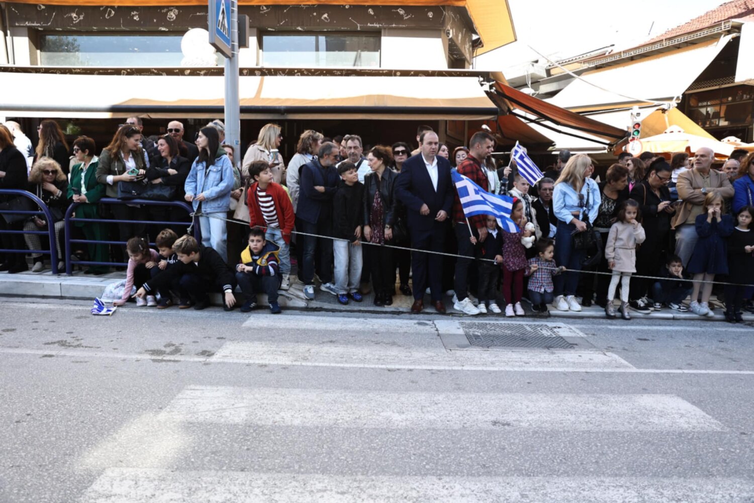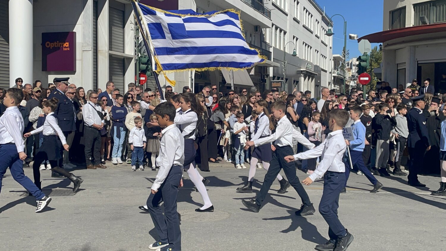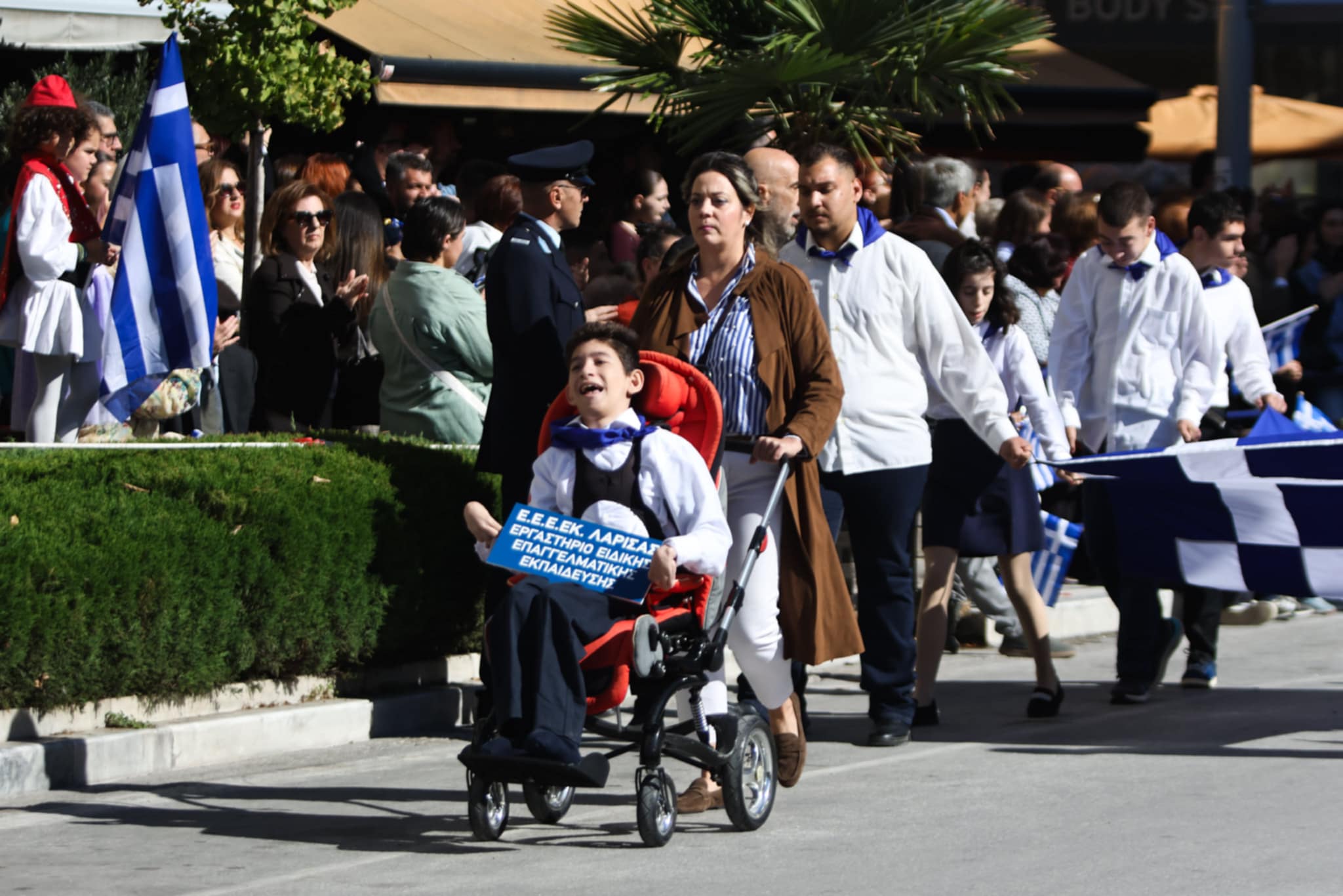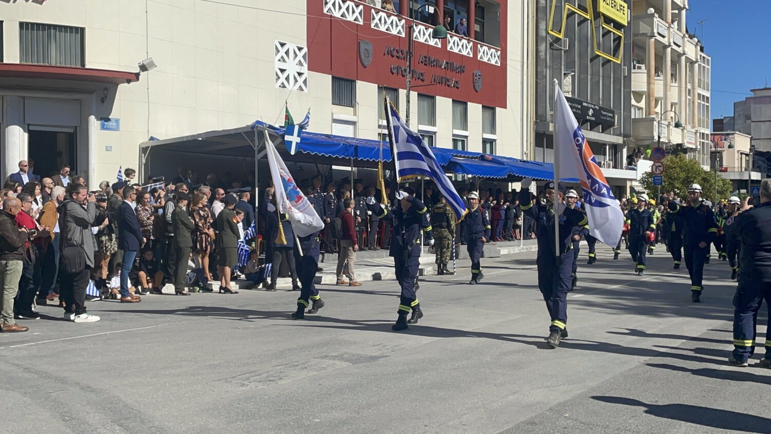 Πλήθος κόσμου έχει κατακλύσει την κεντρική πλατεία της Λάρισας και παρακολουθεί την παρέλαση.