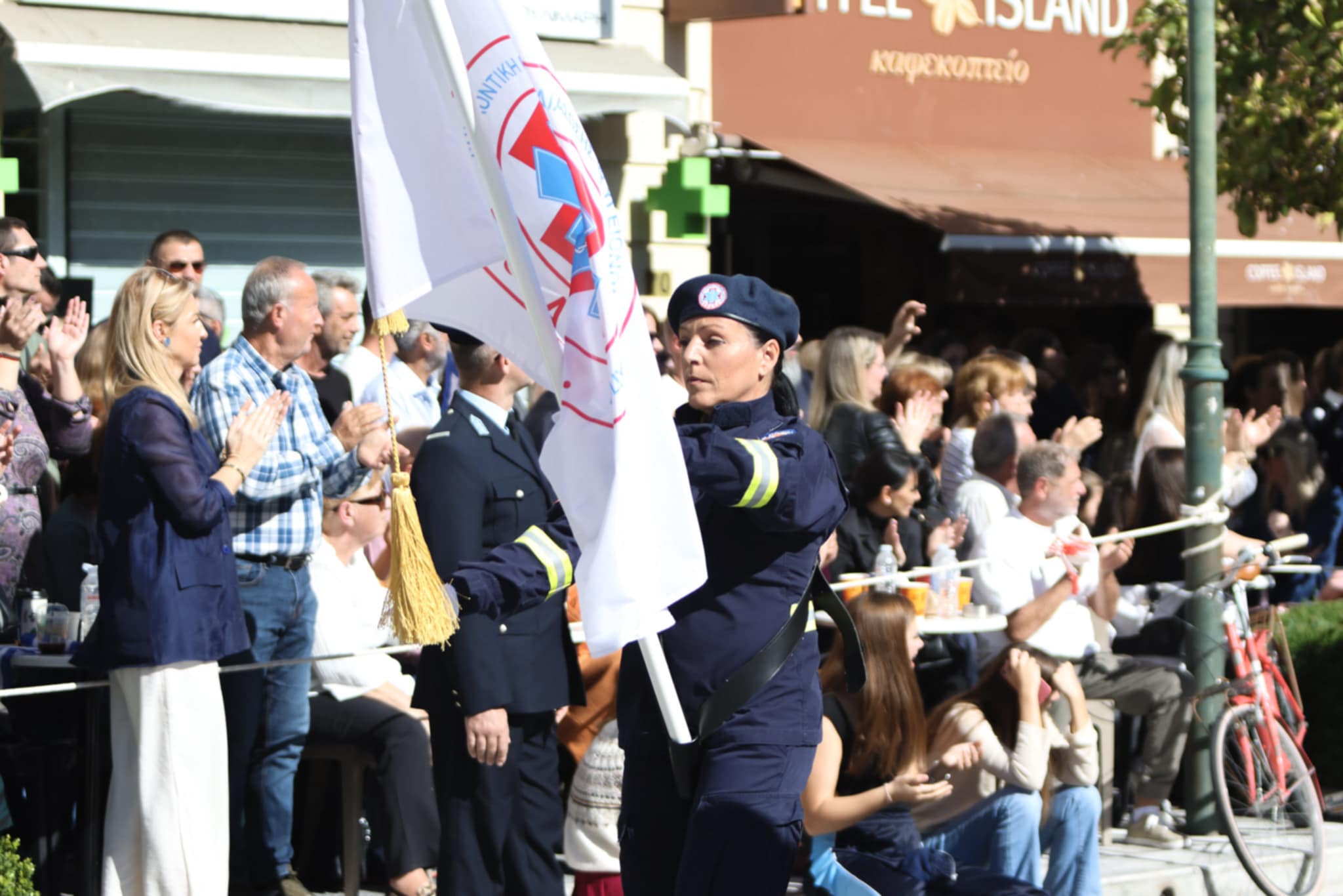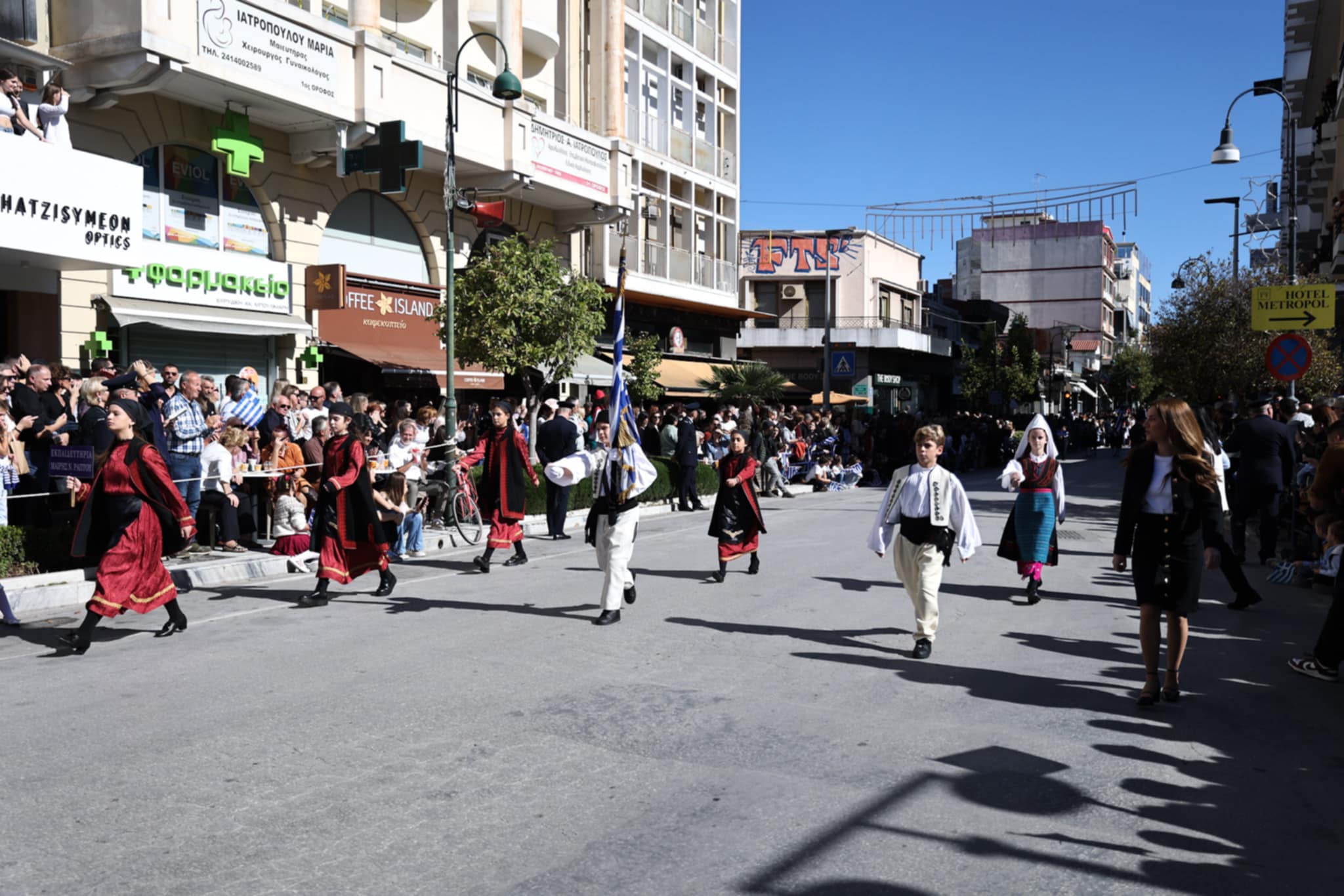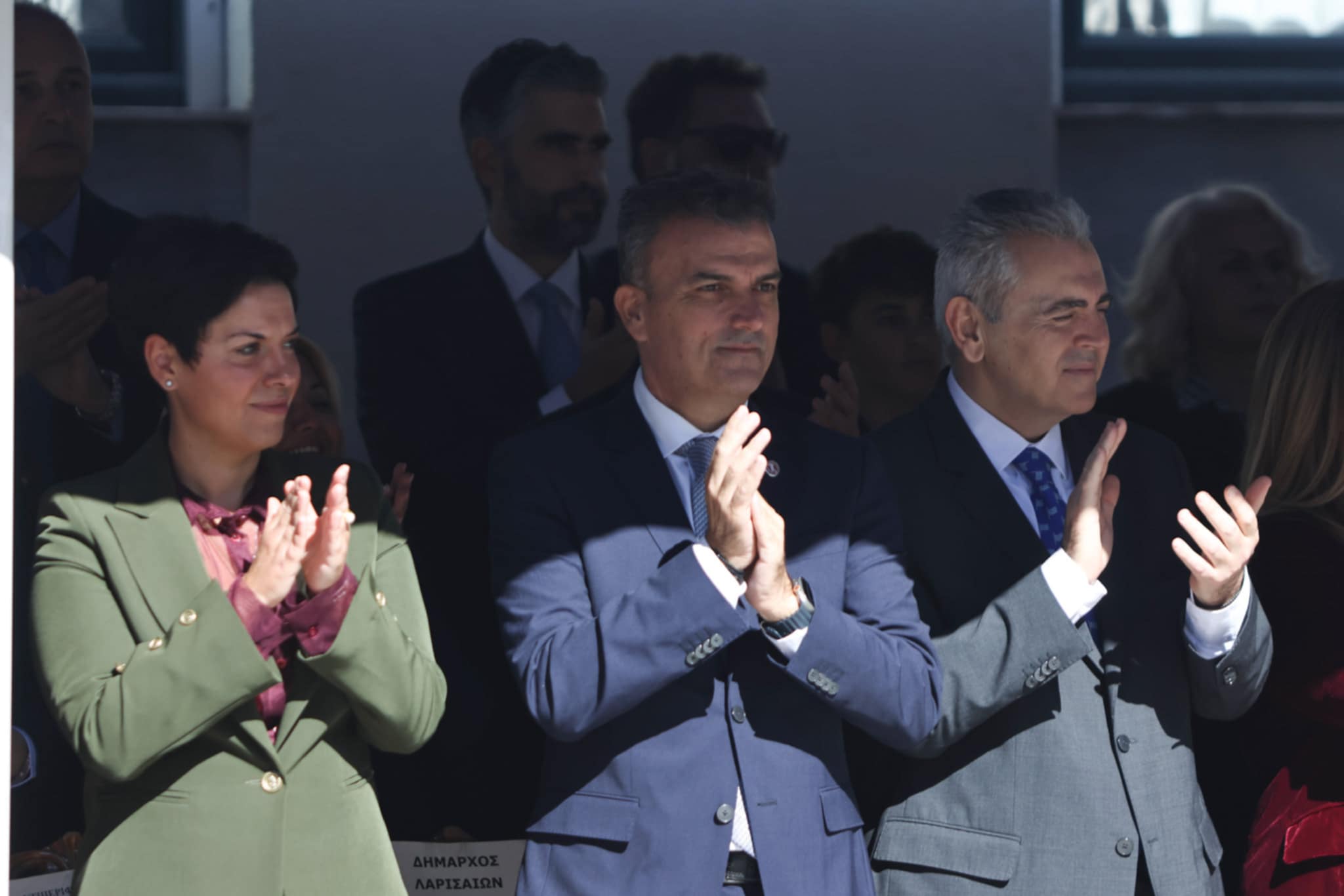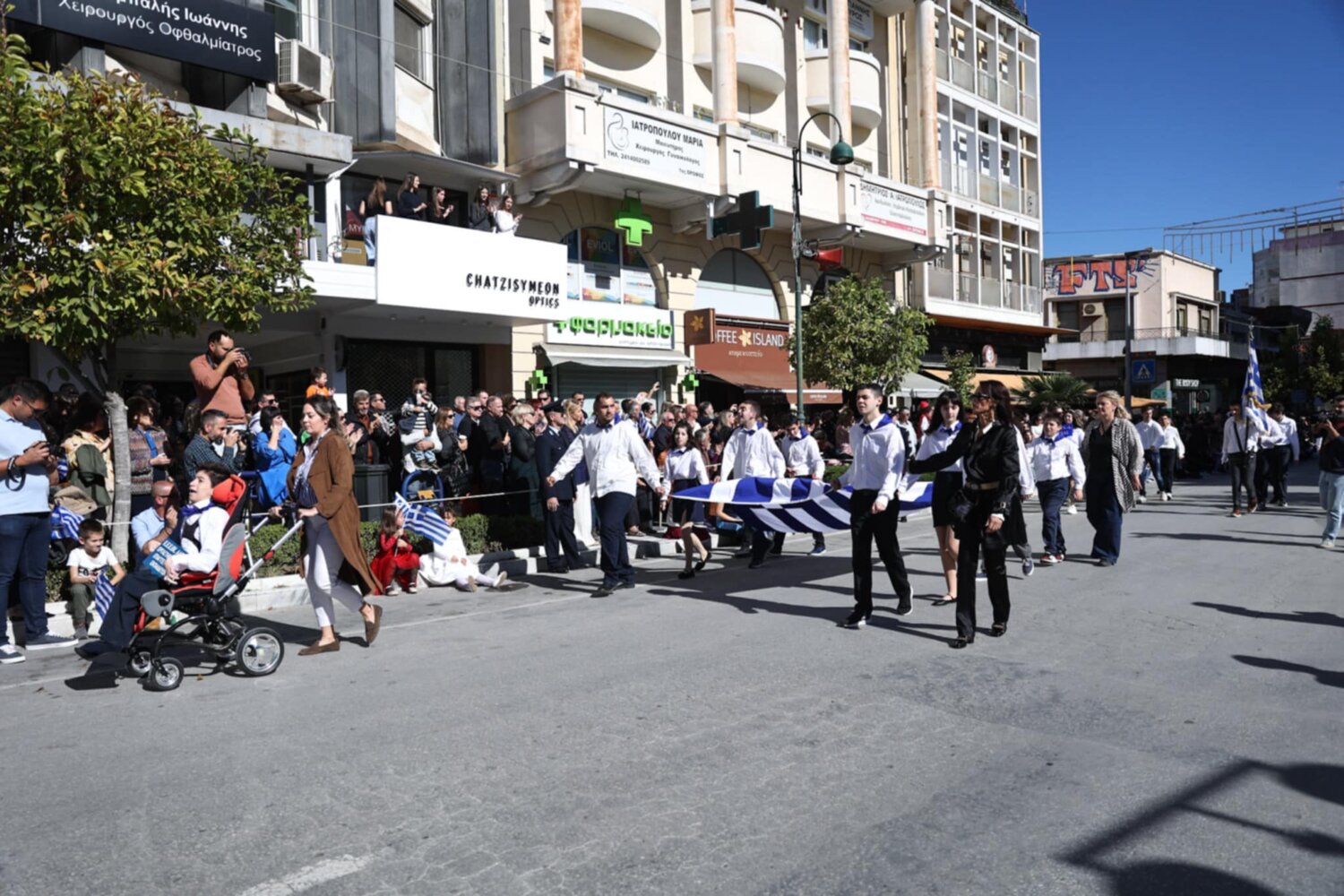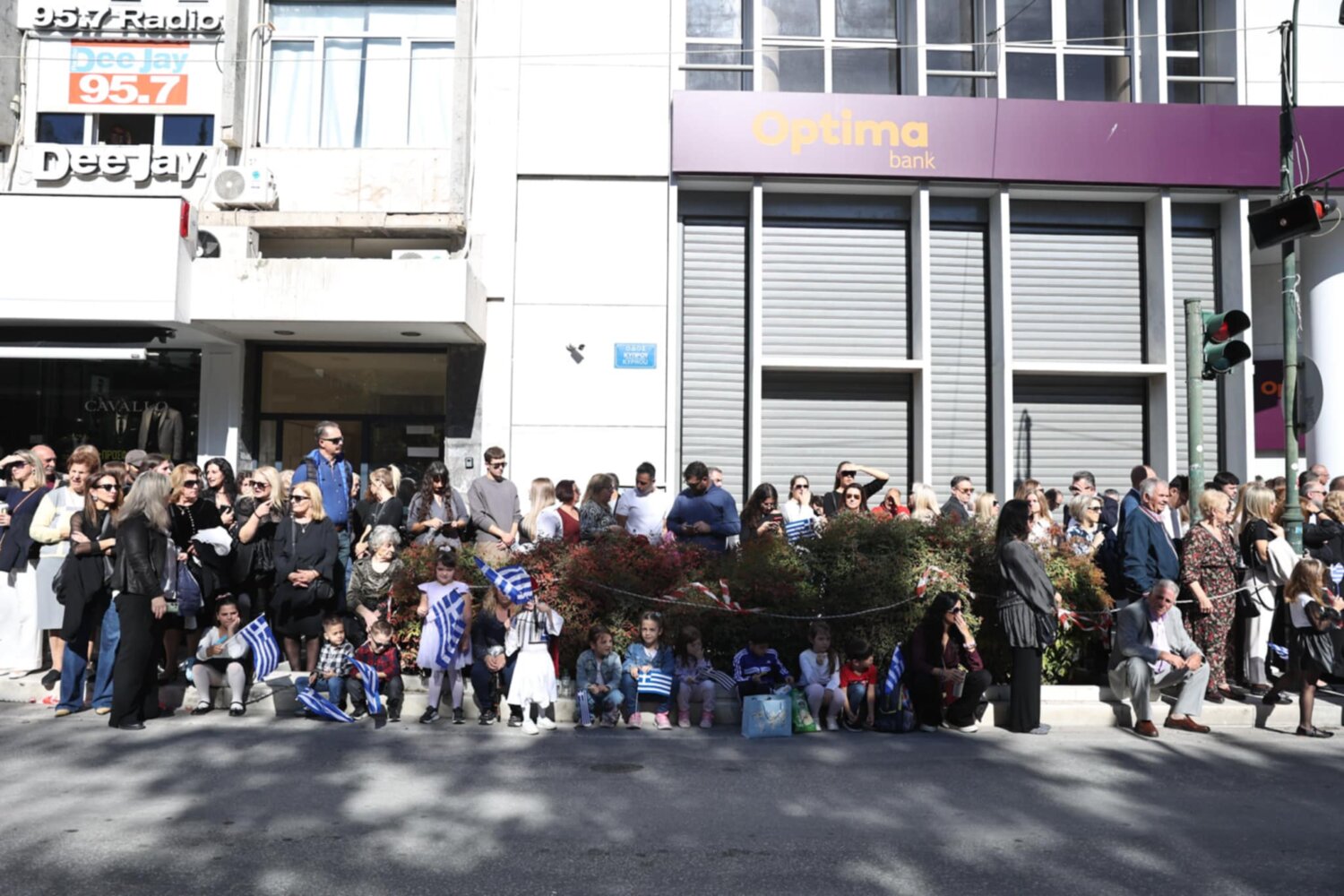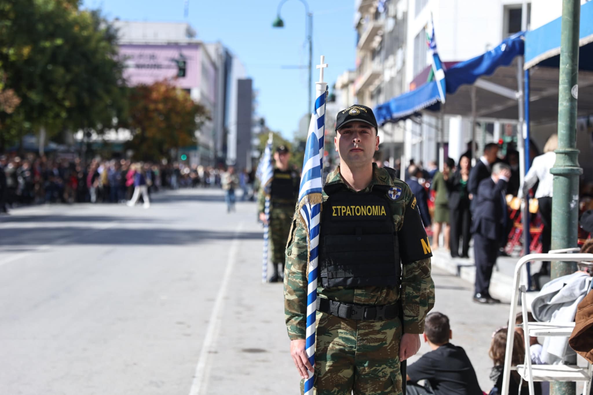 Πλήθος κόσμου έχει κατακλύσει την κεντρική πλατεία της Λάρισας και παρακολουθεί την παρέλαση.