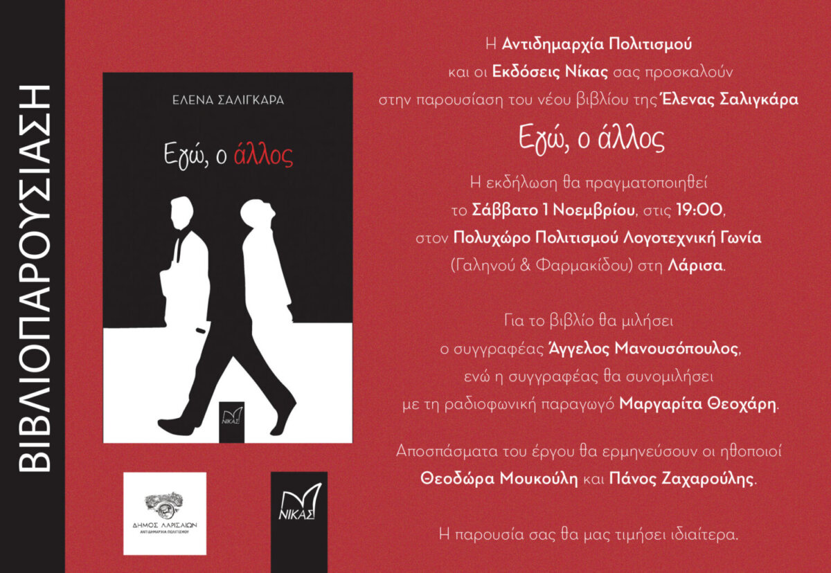 Η Αντιδημαρχία Πολιτισμού και οι Εκδόσεις Νίκας παρουσιάζουν το νέο βιβλίο της Έλενας Σαλιγκάρα «Εγώ ο άλλος», το Σάββατο 1 Νοεμβρίου στις 19.00 στην Λογοτεχνική Γωνία.