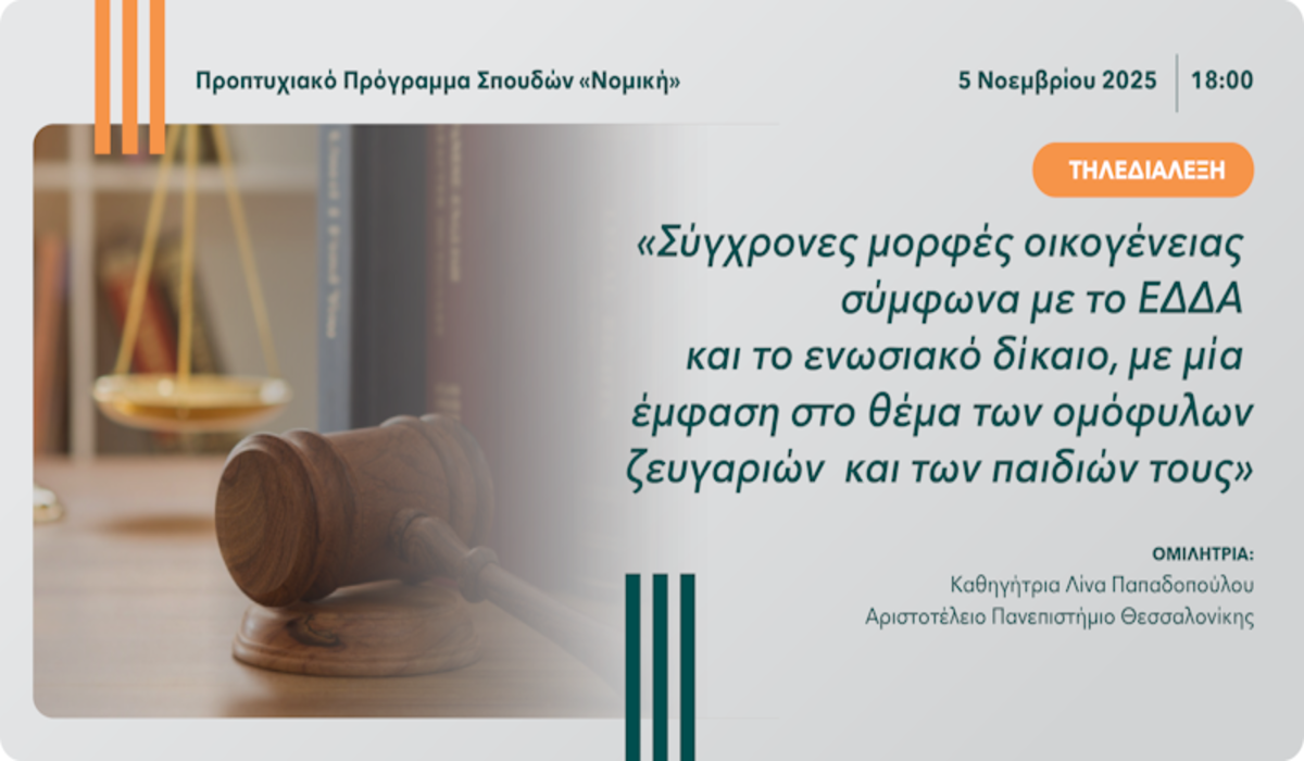 Διαδικτυακή διάλεξη με θέμα «Σύγχρονες μορφές οικογένειας σύμφωνα με το ΕΔΔΑ και το ενωσιακό δίκαιο, με μία έμφαση στο θέμα των ομόφυλων ζευγαριών και των παιδιών τους» διοργανώνει η διδακτική ομάδα της Θεματικής Ενότητας «Εισαγωγή στο Δίκαιο και τη Νομική Μέθοδο – ΝΟΜ 111» του εξ αποστάσεως Προπτυχιακού Προγράμματος Σπουδών «Νομική» του Ανοικτού Πανεπιστημίου Κύπρου (ΑΠΚΥ), την Τετάρτη 5 Νοεμβρίου και ώρα 18:00. Ομιλήτρια θα είναι η κα Λίνα Παπαδοπούλου, Καθηγήτρια Συνταγματικού Δικαίου στο Αριστοτέλειο Πανεπιστήμιο Θεσσαλονίκης και θα συντονίζει ο κ. Δημήτρης Χοτούρας μέλος Συνεργαζόμενου Εκπαιδευτικού Προσωπικού στο ΑΠΚΥ. Η διάλεξη, ανοικτή στο κοινό, θα μεταδίδεται μέσω των εργαλείων τηλεκπαίδευσης του ΑΠΚΥ στον σύνδεσμο https://tinyurl.com/2ms7vyne