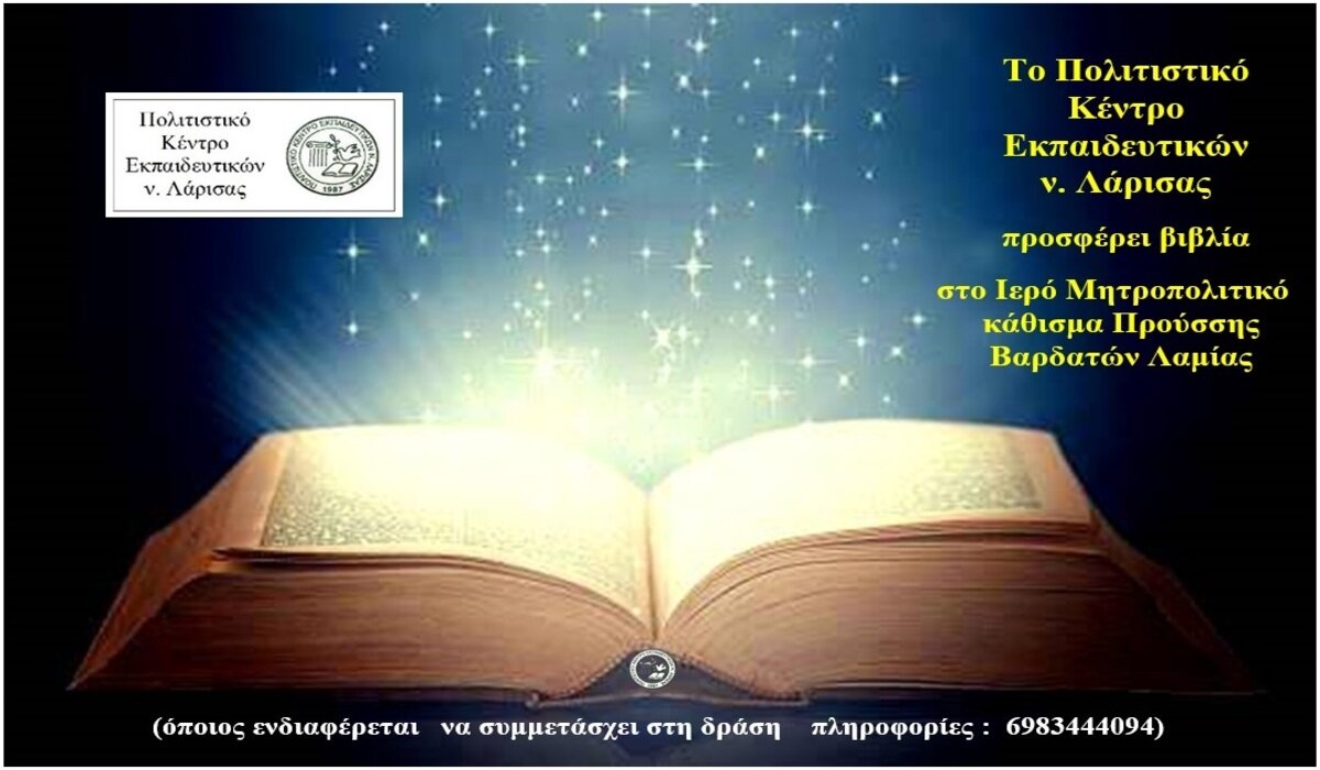 Το Πολιτιστικό Κέντρο Εκπαιδευτικών νομού Λάρισας – ΠΟΚΕΛ, σε συνεργασία με τον Σύνδεσμο Ρουμελιωτών ν. Λάρισας «Ο Αθανάσιος Διάκος» θα προσφέρει βιβλία στο Ιερό Μητροπολιτικό Κάθισμα Παναγίας Προύσσης Βαρδατών Λαμίας, μετά από πρόσκληση του μοναχού Ιερόθεου, προκειμένου να εμπλουτισθεί η βιβλιοθήκη – αναγνωστήριο με νέους τίτλους βιβλίων (λογοτεχνικά, ιστορικά, μυθιστορήματα, παιδικά, κλπ) στο πλαίσιο της μονοήμερης εκδρομής που θα γίνει την 1η Νοεμβρίου.