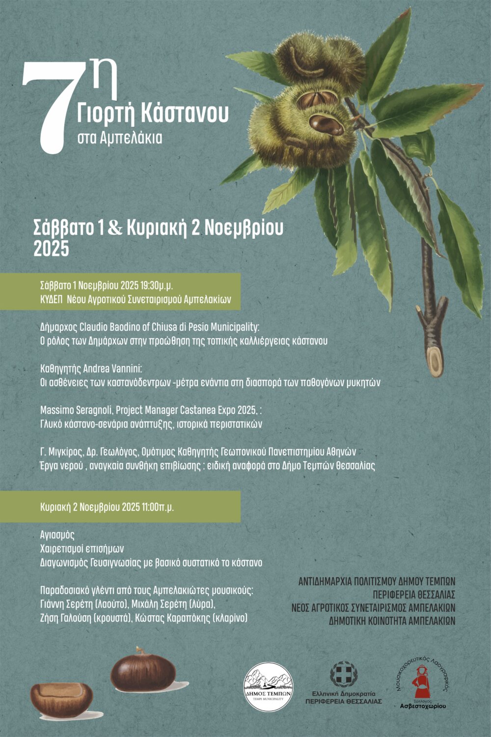 Τo Σάββατο 1 Νοεμβρίου και ώρα 19:30, στο Κτίριο του Νέου Αγροτικού Συνεταιρισμού Αμπελακίων, η εκδήλωση ξεκινά με τις ομιλίες και εισηγήσεις των: Claudio Baodino, Δήμαρχου του Δήμου Chiusa di Pesio: «ο ρόλος των Δημάρχων στην προώθηση της τοπικής καλλιέργειας του κάστανου» , Andrea Vannini: «μέτρα ενάντια στη διασπορά των παθογόνων μυκητών», Massimo Seragnoli, υπεύθυνος έργου Έκθεσης Κάστανου 2025: «γλυκό κάστανο-σενάρια ανάπτυξης, ιστορικά περιστατικών», Γ. Μιγκίρος, Δρ. Γεωλόγος, Ομότιμος Καθηγητής Γεωπονικού Πανεπιστημίου Αθηνών: «έργα νερού-αναγκαία συνθήκη επιβίωσης: ειδική αναφορά στο Δήμο Τεμπών».