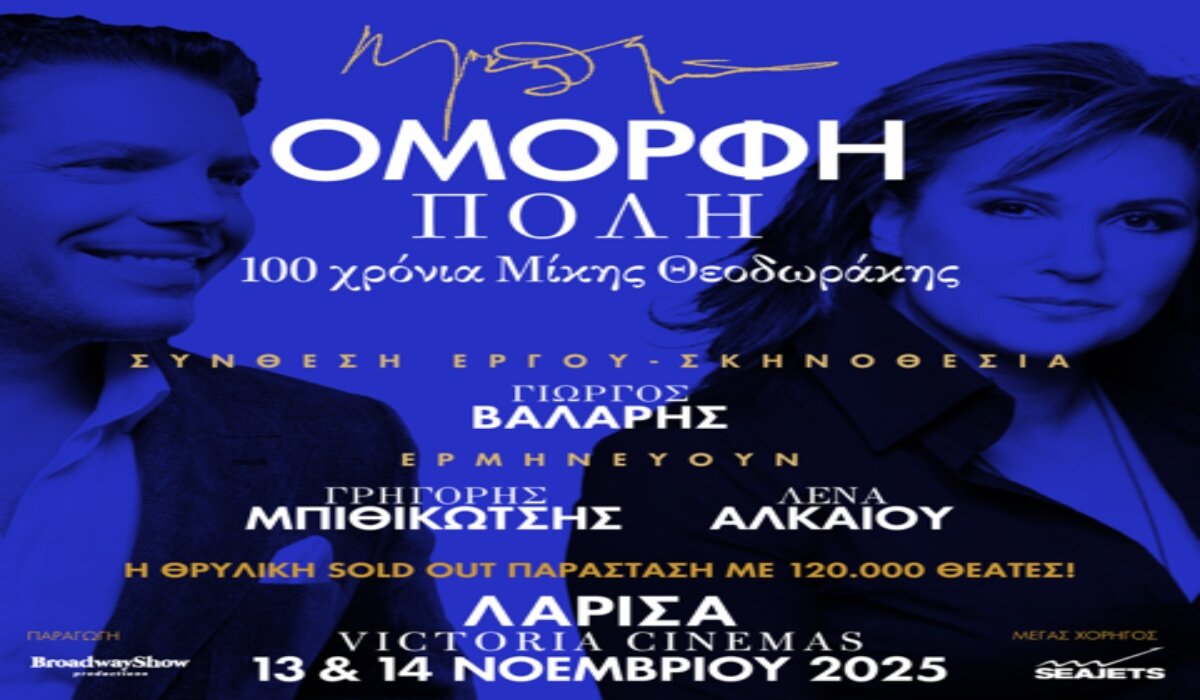 Σκηνοθετημένη από τον καταξιωμένο δημιουργό Γιώργο Βάλαρη με την ευαισθησία και τη θεατρική ποιότητα που αρμόζει στο εμβληματικό έργο του Μίκη Θεοδωράκη, η θρυλική μουσικοθεατρική παράσταση «Όμορφη Πόλη», που συγκίνησε κοινό και κριτικούς σε Αθήνα από το 2020 έως σήμερα, επιστρέφει για λίγες παραστάσεις και παρουσιάζεται για πρώτη φορά σε μεγάλες πόλεις και νησιά σε όλη την Ελλάδα τη χειμερινή περίοδο 2025-26. Η παράσταση αποτελεί έναν βαθύ και συγκινητικό φόρο τιμής στον αείμνηστο συνθέτη, στο πλαίσιο του «Αφιερωματικού Έτους Μίκη Θεοδωράκη», όπως έχει ανακηρυχθεί επίσημα από το Υπουργείο Πολιτισμού, με αφορμή τα 100 χρόνια από τη γέννησή του.