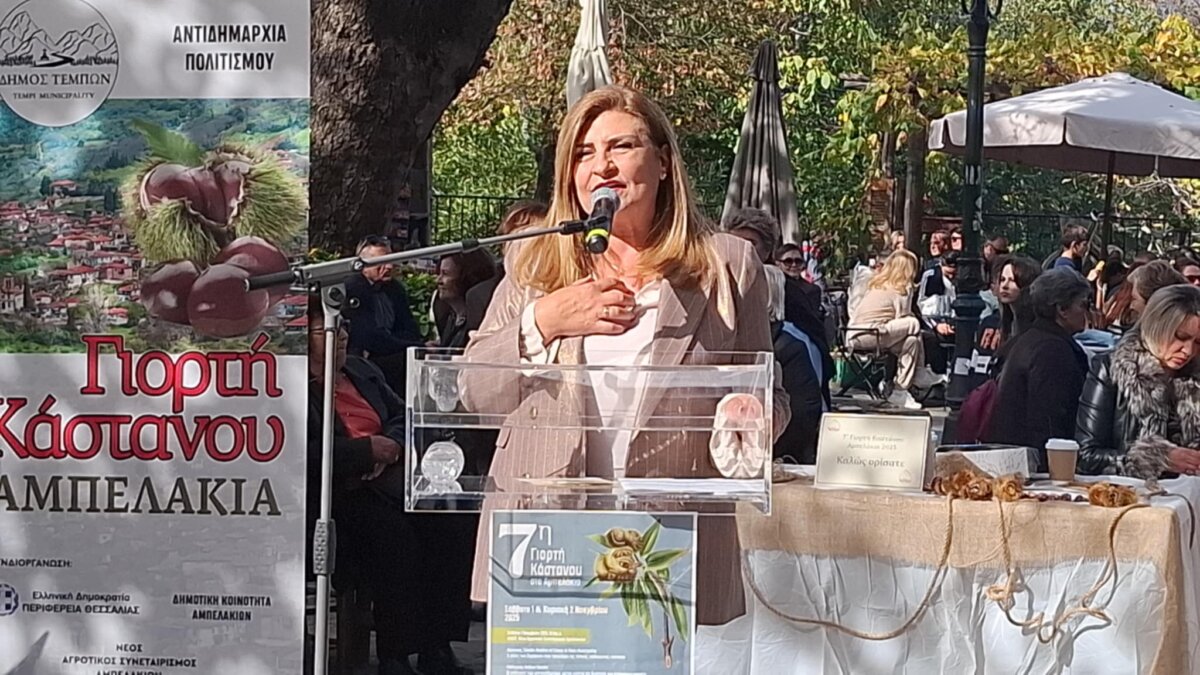«Ευχαριστώ θερμά για την τιμητική πρόσκληση να βρεθώ σήμερα σε μια γιορτή που έχει γίνει σημείο αναφοράς για τον τόπο μας – τη γιορτή του κάστανου, εδώ στα όμορφα Αμπελάκια. Μια γιορτή -η 7ηστη σειρά- που πέρα από τη χαρά της συνάντησης, εκφράζει την πίστη μας σ’ ένα προϊόν που κρατά ζωντανή την παράδοση, την οικονομία και την ταυτότητα της περιοχής.