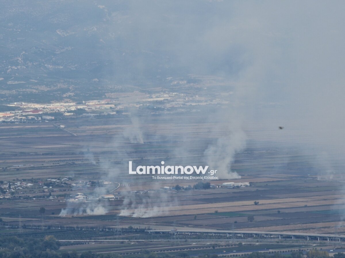 Οι εικόνες από την πεδιάδα της Λαμίας είναι αποκαλυπτικές: δεκάδες στήλες καπνού υψώνονται σε όλο το μήκος του κάμπου, δημιουργώντας ένα αποπνικτικό νέφος που έχει επεκταθεί μέχρι και πάνω από την πόλη. Η ορατότητα στην περιοχή είναι περιορισμένη, ενώ η έντονη οσμή καμένου είναι αισθητή σε μεγάλη ακτίνα.